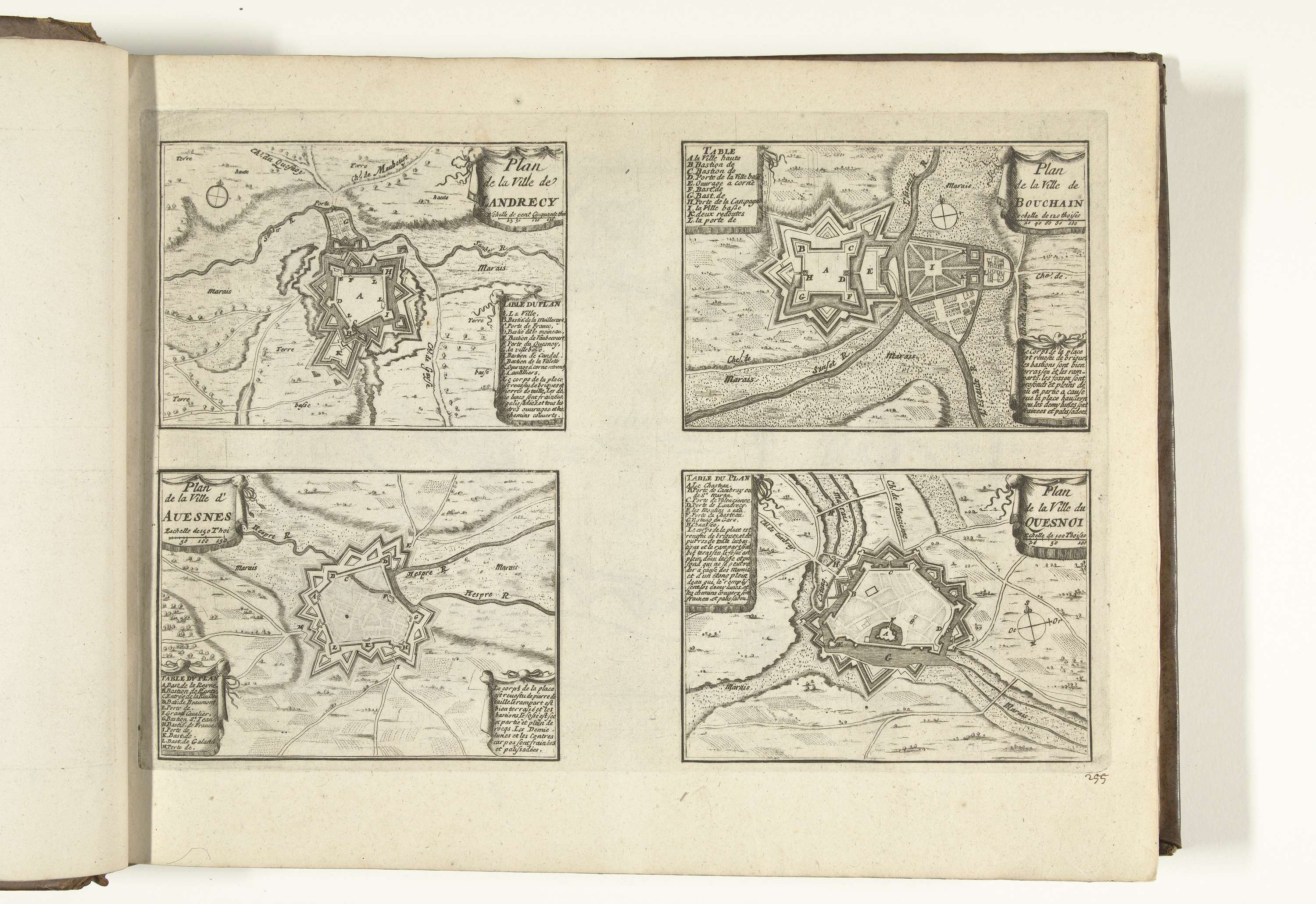 Blad met vier plattegronden van de versterkingen om de steden Landrecies, Bouchain, Avesnes en le Quesnoy. Plaat nr. 255 in deel XI van het prentwerk: Les Forces de l'Europe, Asie, Afrique et Amerique ... Comme aussi les Cartes des Côtes de France et d'Espagne uit 1726, dit tweede deel met 271 met de hand genummerde ...