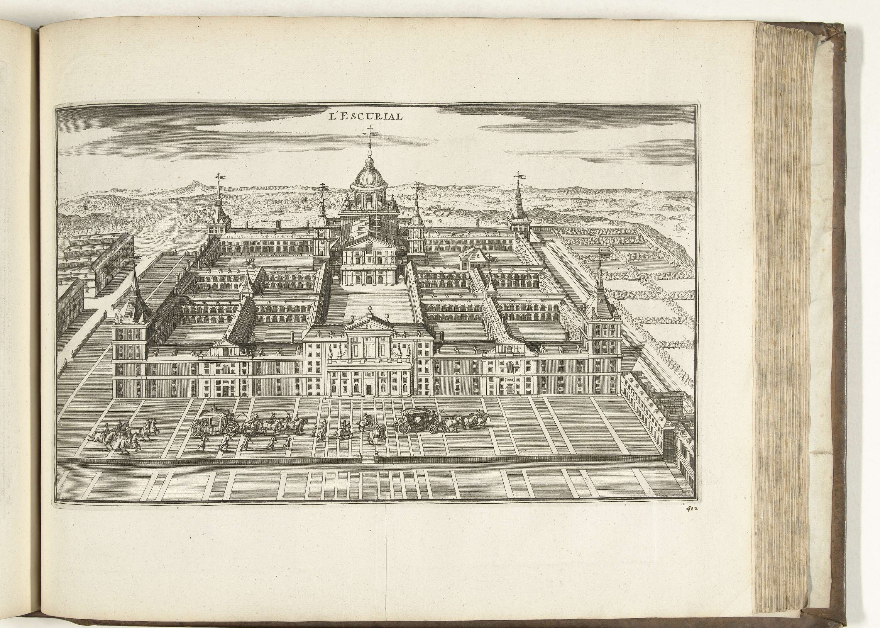 Gezicht op het Escorial. Plaat nr. 412 in deel XVII van het prentwerk: Les Forces de l'Europe, Asie, Afrique et Amerique ... Comme aussi les Cartes des Côtes de France et d'Espagne uit 1726, dit tweede deel met 271 met de hand genummerde platen van vermaarde sterke steden en vestingen in het kader van de ...