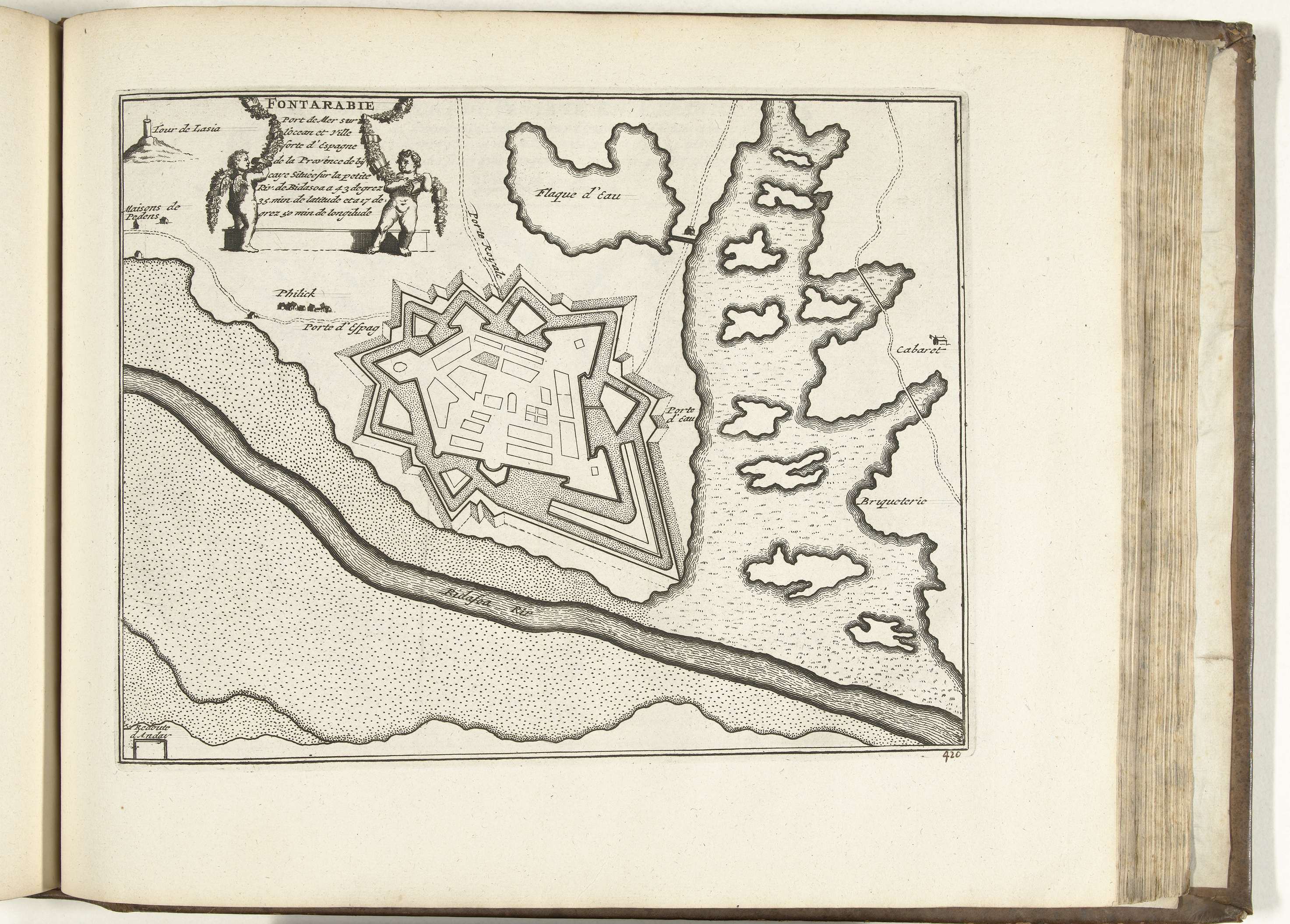 Plattegrond van de versterkingen om de Franse stad Fuenterrabía. Plaat nr. 420 in deel XVII van het prentwerk: Les Forces de l'Europe, Asie, Afrique et Amerique ... Comme aussi les Cartes des Côtes de France et d'Espagne uit 1726, dit tweede deel met 271 met de hand genummerde platen van vermaarde sterke steden en vestingen ...