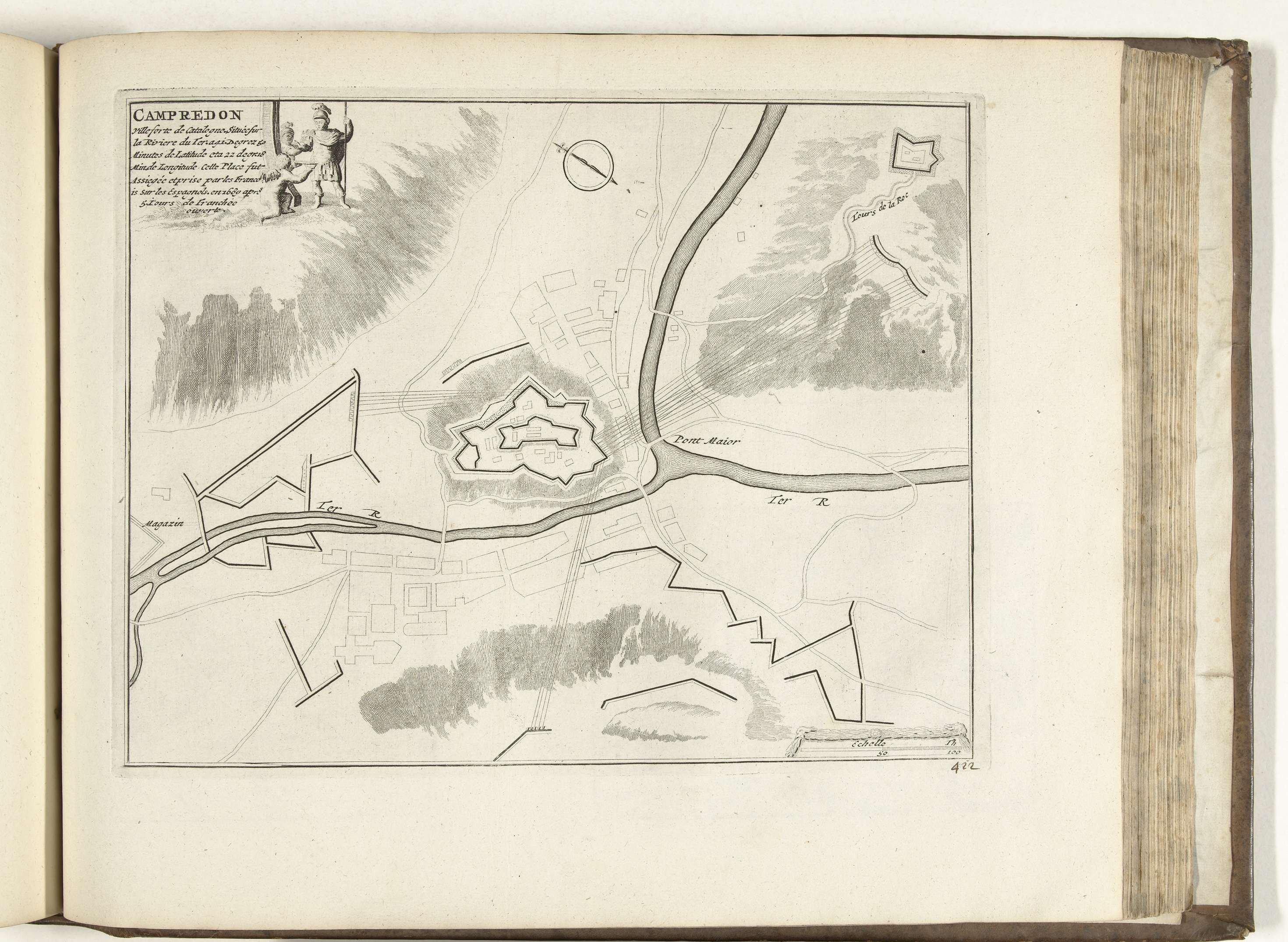 Beleg van het Spaanse fort Campredon in Calatonië aan de rivier Ter door het Franse leger, veroverd in 1689. Plaat nr. 422 in deel XVII van het prentwerk: Les Forces de l'Europe, Asie, Afrique et Amerique ... Comme aussi les Cartes des Côtes de France et d'Espagne uit 1726, dit tweede deel met 271 met ...