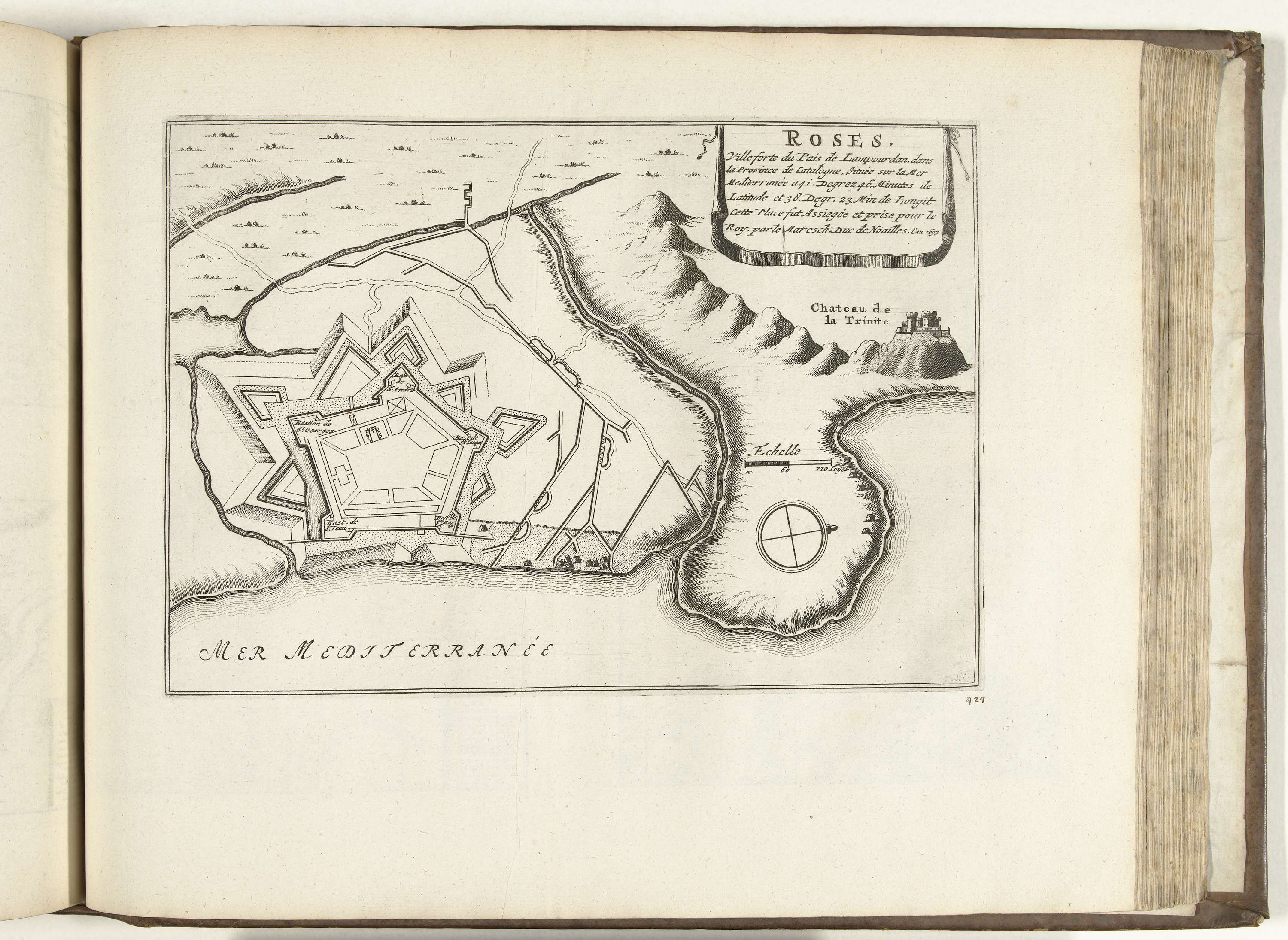 Plattegrond van de versterkingen om Spaanse stad Rosas. Plaat nr. 424 in deel XVII van het prentwerk: Les Forces de l'Europe, Asie, Afrique et Amerique ... Comme aussi les Cartes des Côtes de France et d'Espagne uit 1726, dit tweede deel met 271 met de hand genummerde platen van vermaarde sterke steden en vestingen in ...