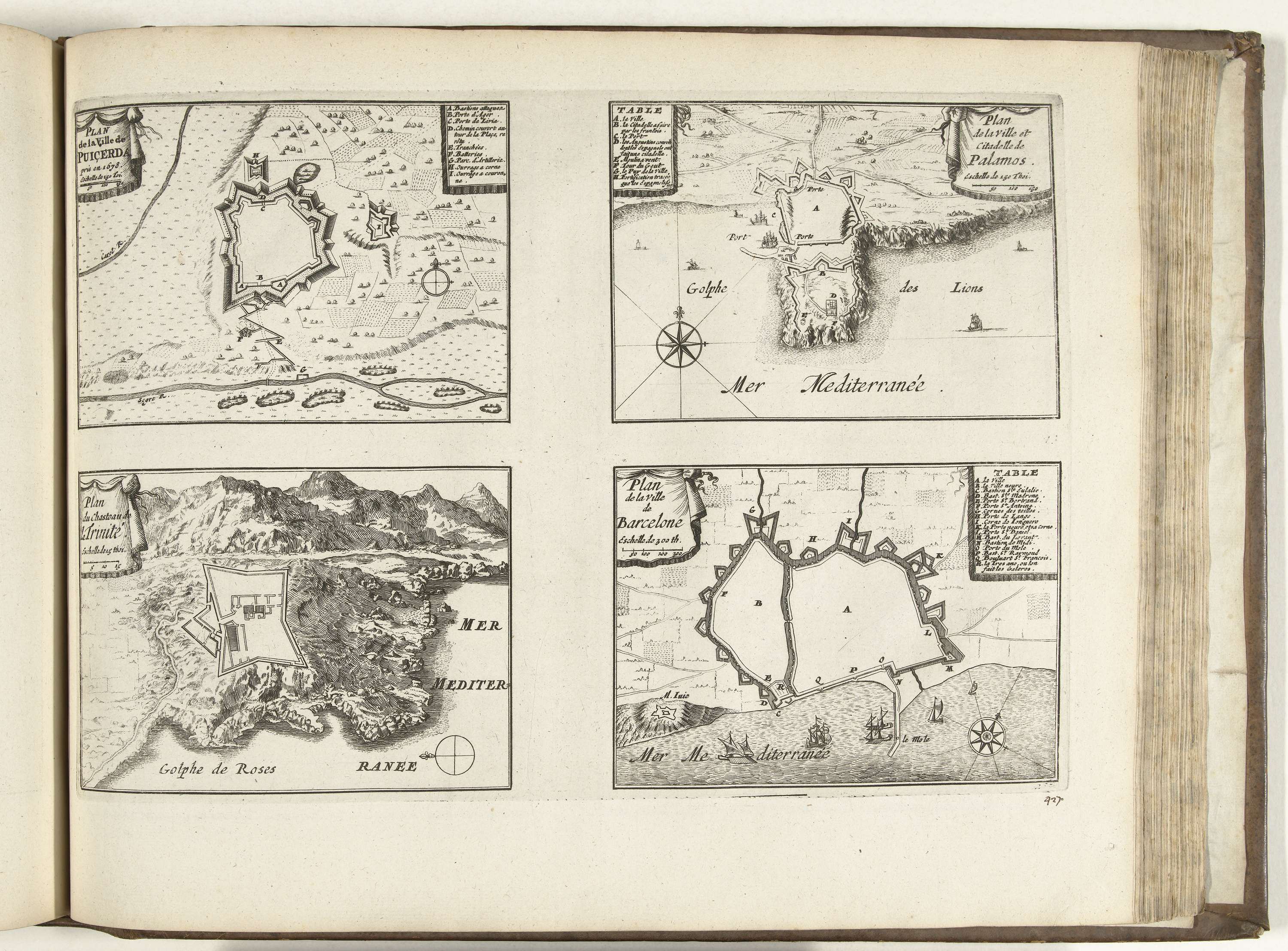Blad met vier plattegronden van de versterkingen om de Spaanse steden Puigcerdá, Palamos, Château de la Trinité en Barcelona. Plaat nr. 427 in deel XVII van het prentwerk: Les Forces de l'Europe, Asie, Afrique et Amerique ... Comme aussi les Cartes des Côtes de France et d'Espagne uit 1726, dit tweede deel met 271 met ...