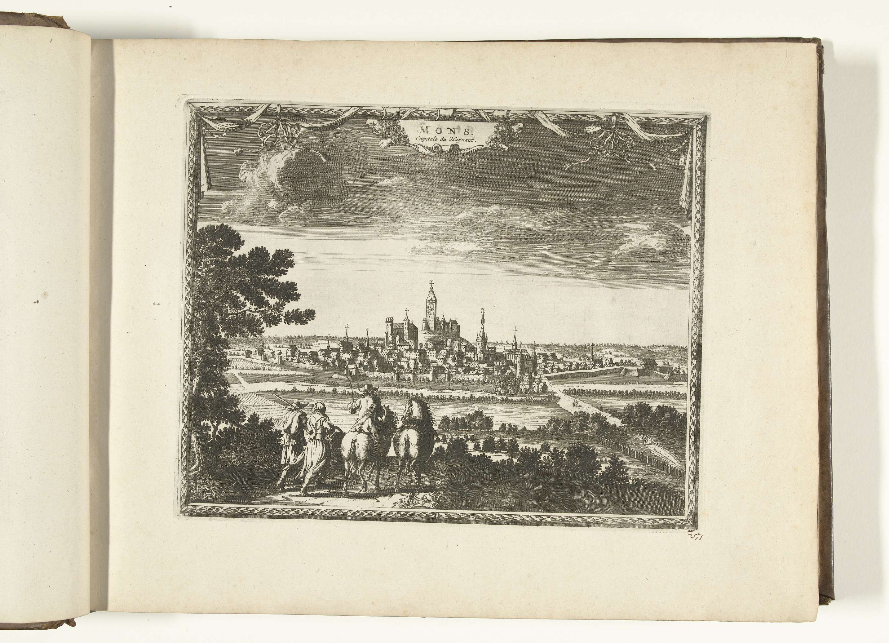 Gezicht op Bergen (Mons) in Henegouwen, op de voorgrond twee reizigers en een ruiter met een paard. Plaat nr. 257 in deel XI van het prentwerk: Les Forces de l'Europe, Asie, Afrique et Amerique ... Comme aussi les Cartes des Côtes de France et d'Espagne uit 1726, dit tweede deel met 271 met de hand ...