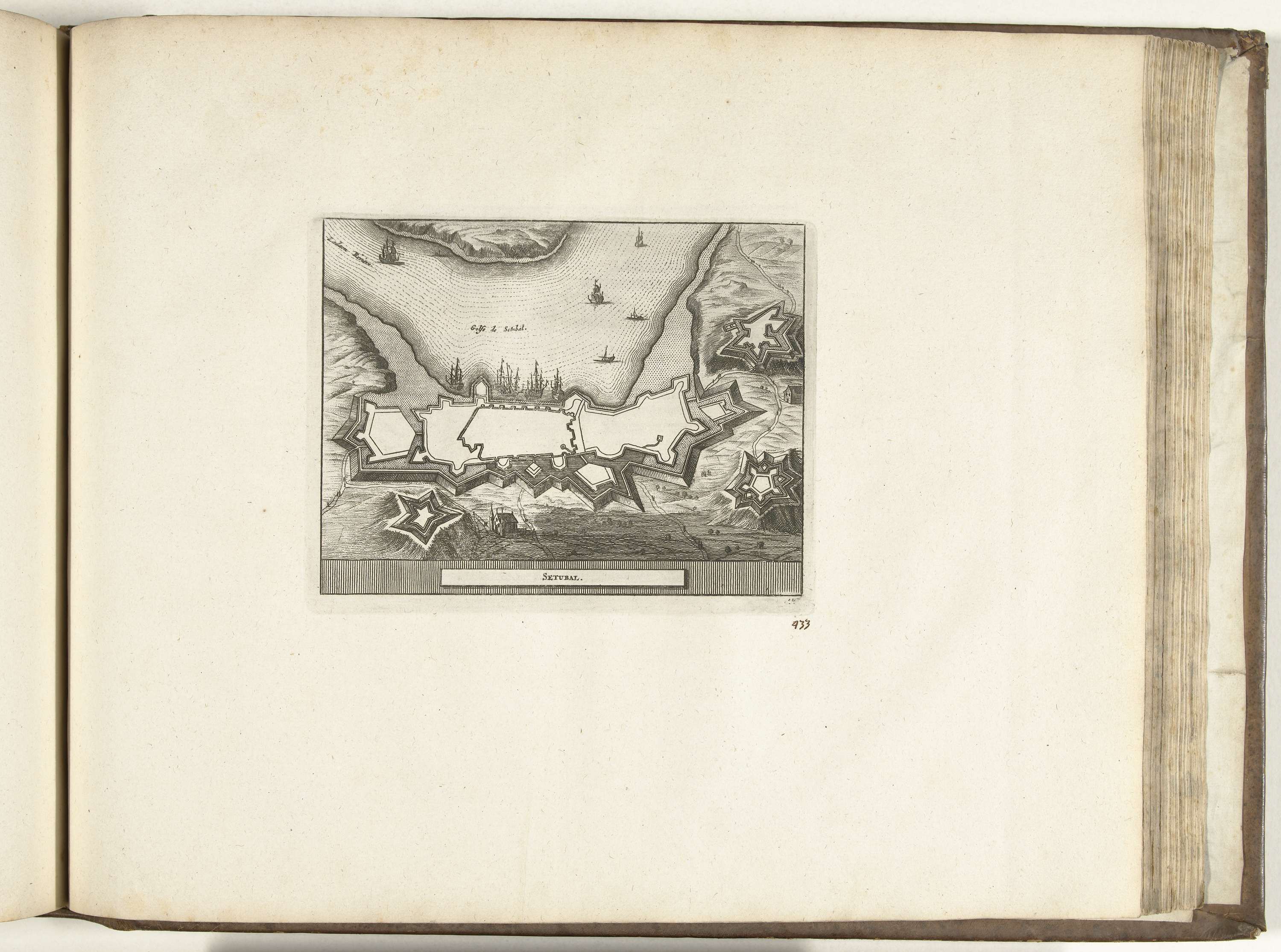 Plattegrond van de versterkingen om de Portugese havenstad Setúbal. Plaat nr. 433 in deel XVII van het prentwerk: Les Forces de l'Europe, Asie, Afrique et Amerique ... Comme aussi les Cartes des Côtes de France et d'Espagne uit 1726, dit tweede deel met 271 met de hand genummerde platen van vermaarde sterke steden en vestingen ...