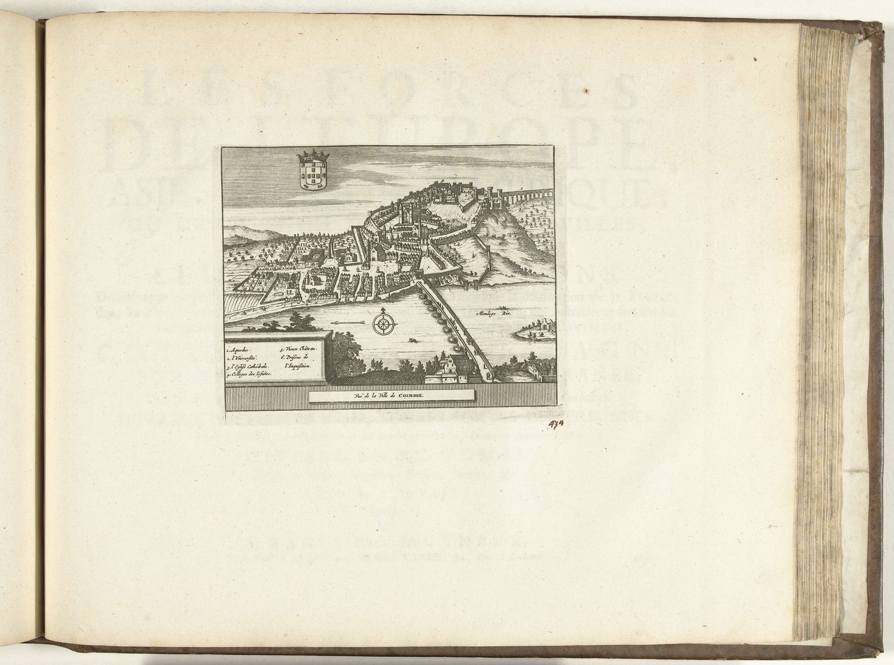 Gezicht op de Portugese stad Coimbra. Plaat nr. 434 in deel XVII van het prentwerk: Les Forces de l'Europe, Asie, Afrique et Amerique ... Comme aussi les Cartes des Côtes de France et d'Espagne uit 1726, dit tweede deel met 271 met de hand genummerde platen van vermaarde sterke steden en vestingen in het kader ...