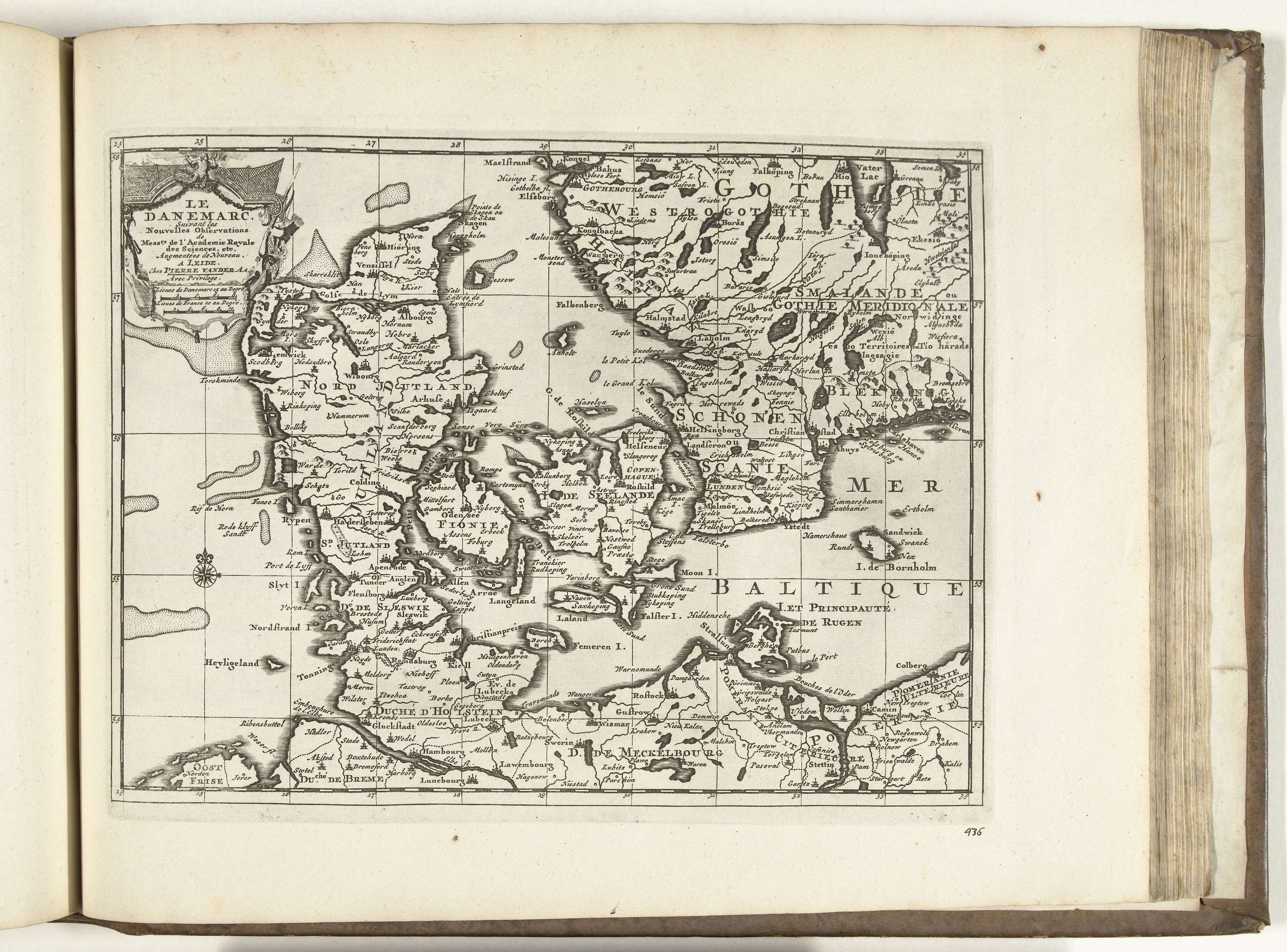 Kaart van Denemarken. Plaat nr. 436 in deel XVIII van het prentwerk: Les Forces de l'Europe, Asie, Afrique et Amerique ... Comme aussi les Cartes des Côtes de France et d'Espagne uit 1726, dit tweede deel met 271 met de hand genummerde platen van vermaarde sterke steden en vestingen in het kader van de Spaanse ...