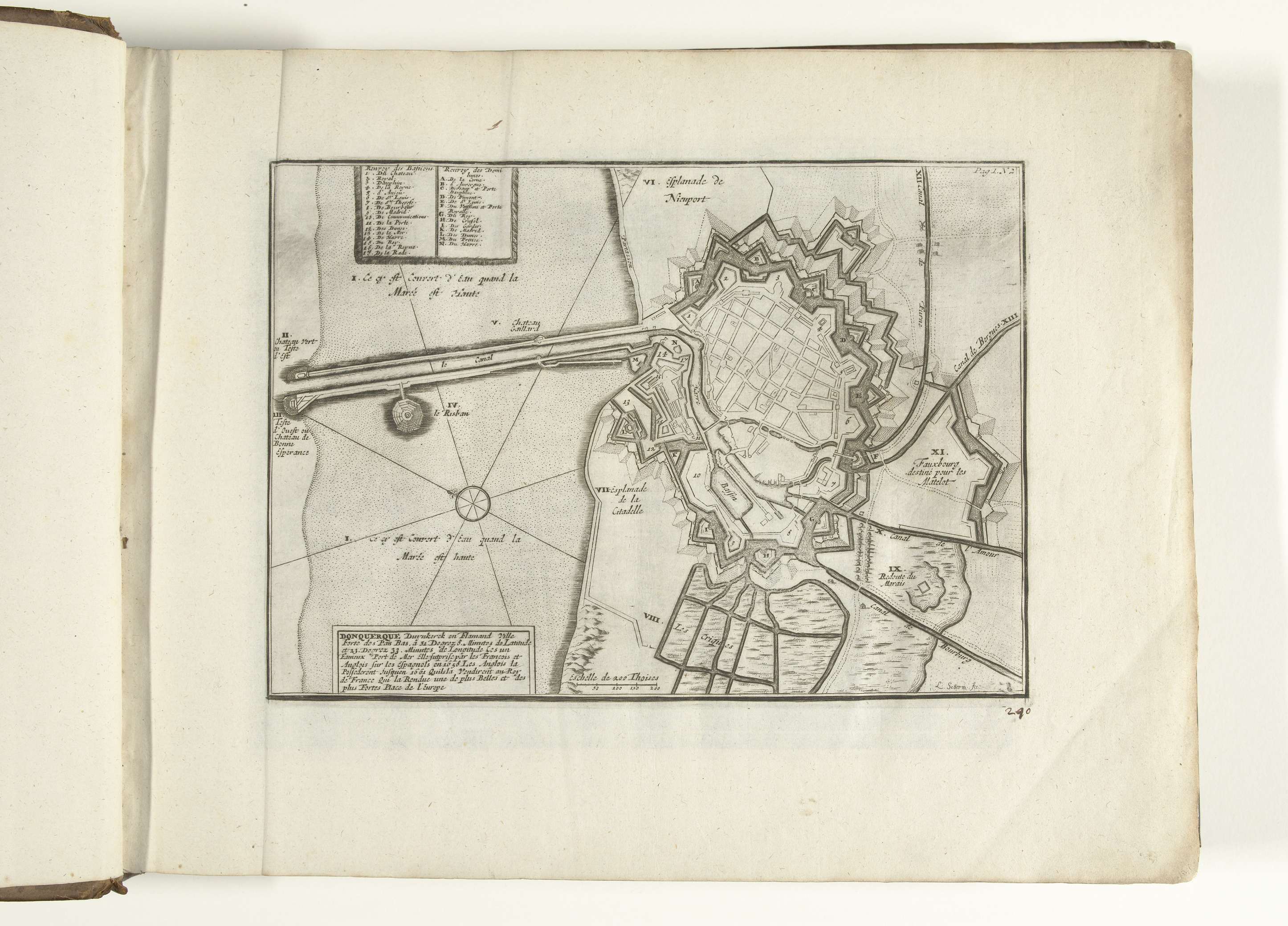 Plattegrond van de verdedigingswerken om de stad Duinkerke. Gemerkt rechtsboven: Pag. 1. N2. Plaat nr. 121 in deel XI van het prentwerk: Les Forces de l'Europe, Asie, Afrique et Amerique ... Comme aussi les Cartes des Côtes de France et d'Espagne uit 1726, dit tweede deel met 271 met de hand genummerde platen van vermaarde ...