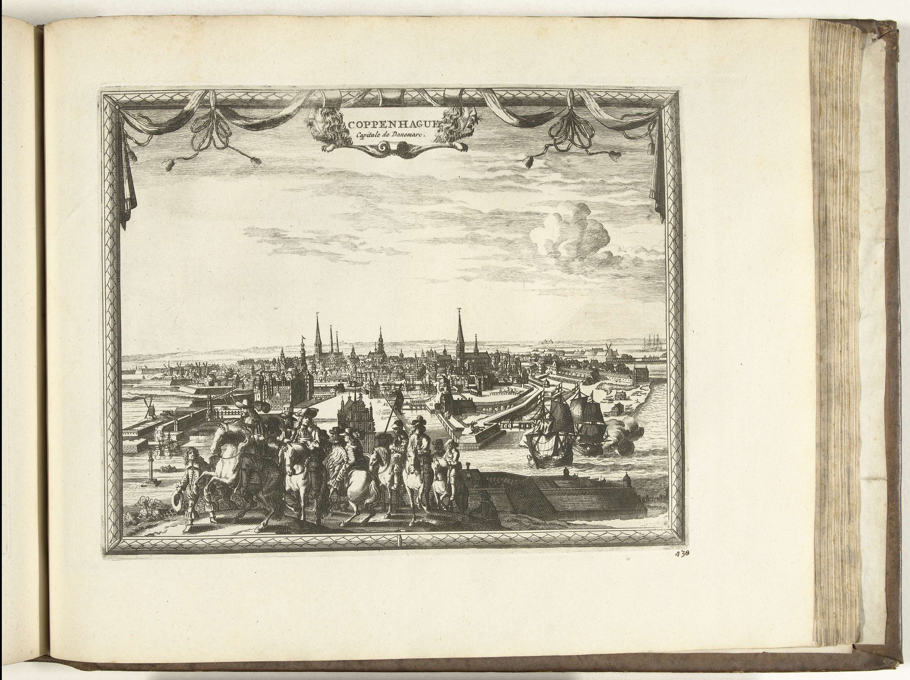 Gezicht op de Deense stad Kopenhagen, op de voorgrond een groep ruiters. Plaat nr. 438 in deel XVIII van het prentwerk: Les Forces de l'Europe, Asie, Afrique et Amerique ... Comme aussi les Cartes des Côtes de France et d'Espagne uit 1726, dit tweede deel met 271 met de hand genummerde platen van vermaarde sterke ...