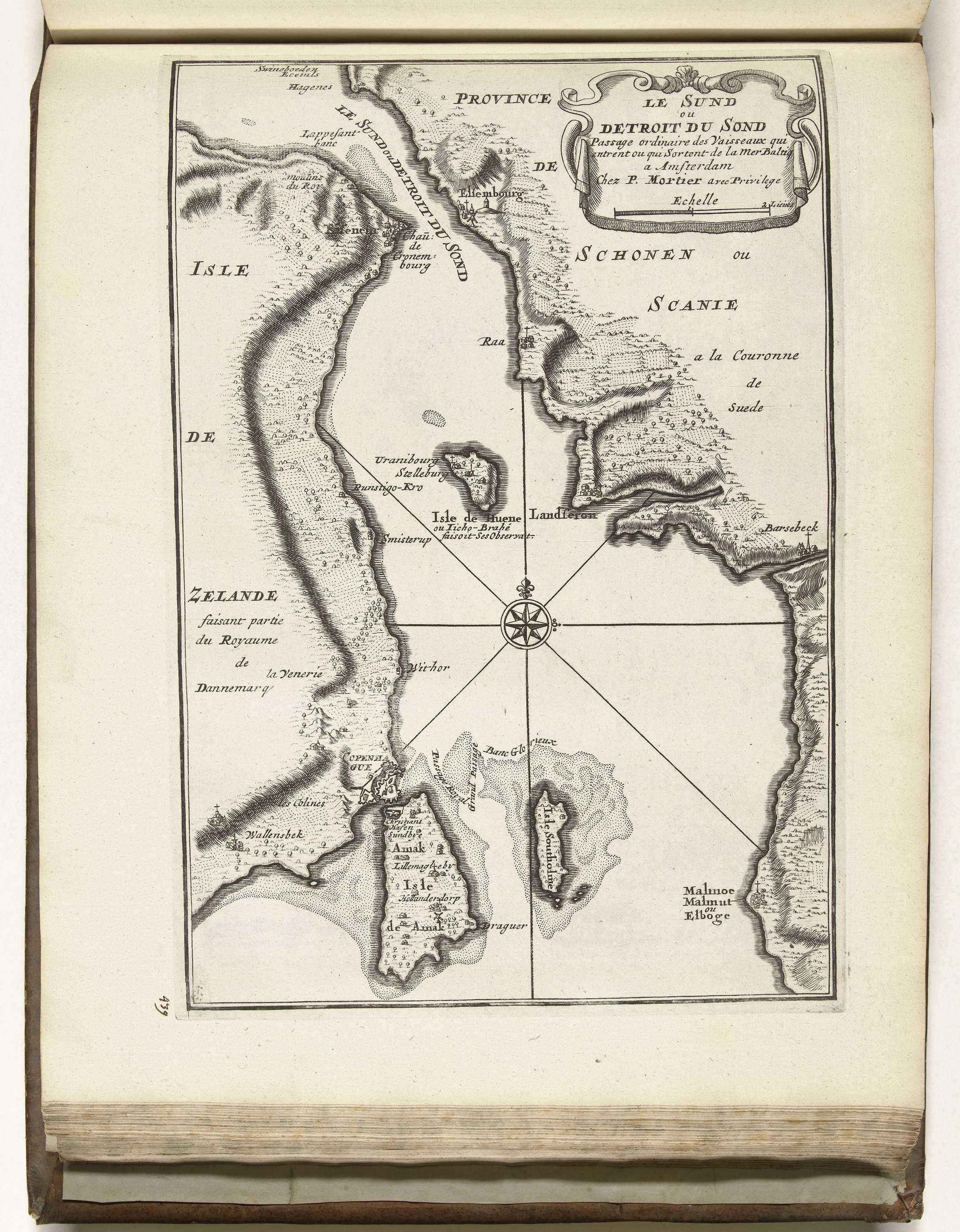 Kaart van het Sont, de zeestraat tussen Denemarken en Zweden. Plaat nr. 439 in deel XVIII van het prentwerk: Les Forces de l'Europe, Asie, Afrique et Amerique ... Comme aussi les Cartes des Côtes de France et d'Espagne uit 1726, dit tweede deel met 271 met de hand genummerde platen van vermaarde sterke steden en ...