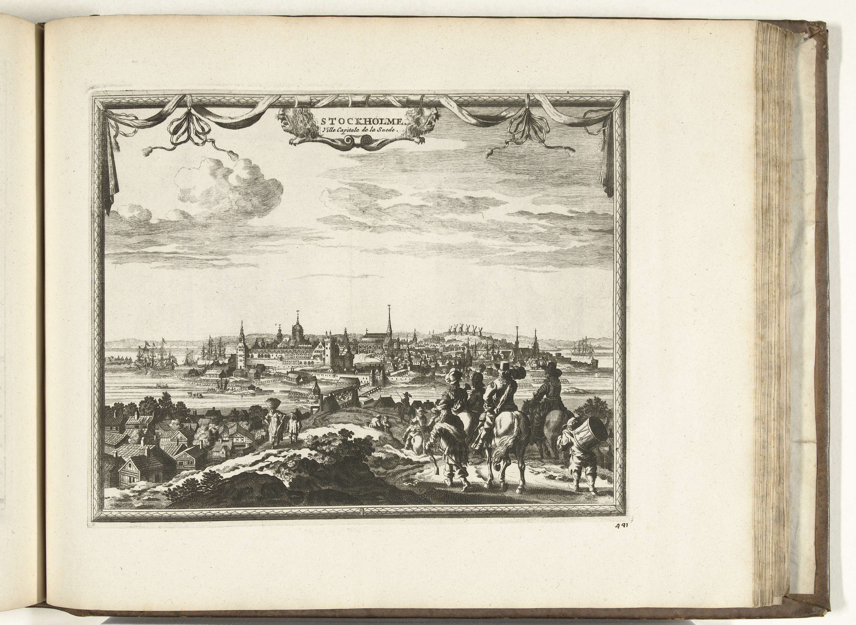 Gezicht op Stockholm, op de voorgrond een groep officieren te paard. Plaat nr. 441 in deel XVIII van het prentwerk: Les Forces de l'Europe, Asie, Afrique et Amerique ... Comme aussi les Cartes des Côtes de France et d'Espagne uit 1726, dit tweede deel met 271 met de hand genummerde platen van vermaarde sterke steden ...
