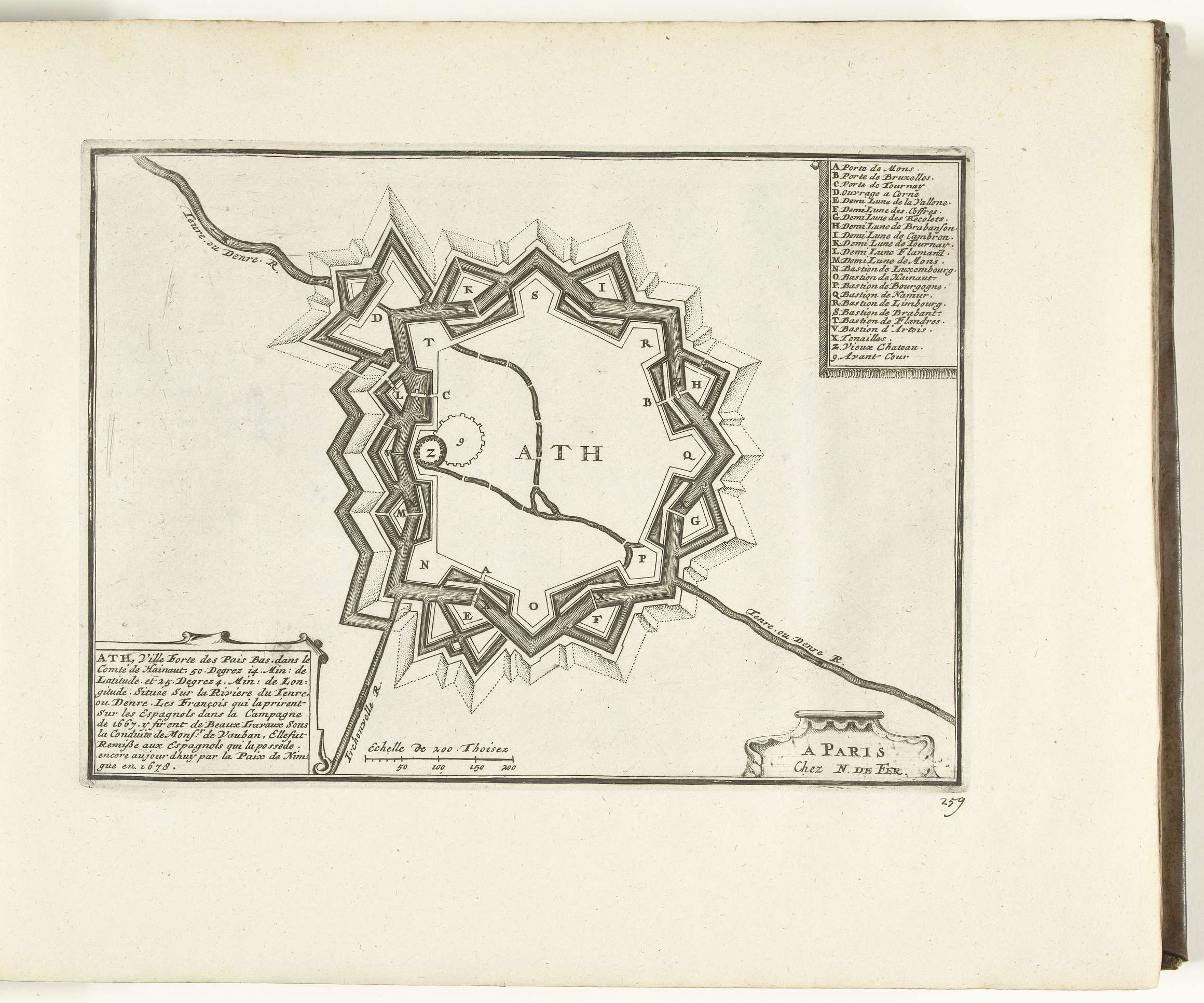 Plattegrond van de versterkingen om de stad Ath in Henegouwen. Plaat nr. 259 in deel XI van het prentwerk: Les Forces de l'Europe, Asie, Afrique et Amerique ... Comme aussi les Cartes des Côtes de France et d'Espagne uit 1726, dit tweede deel met 271 met de hand genummerde platen van vermaarde sterke steden en ...