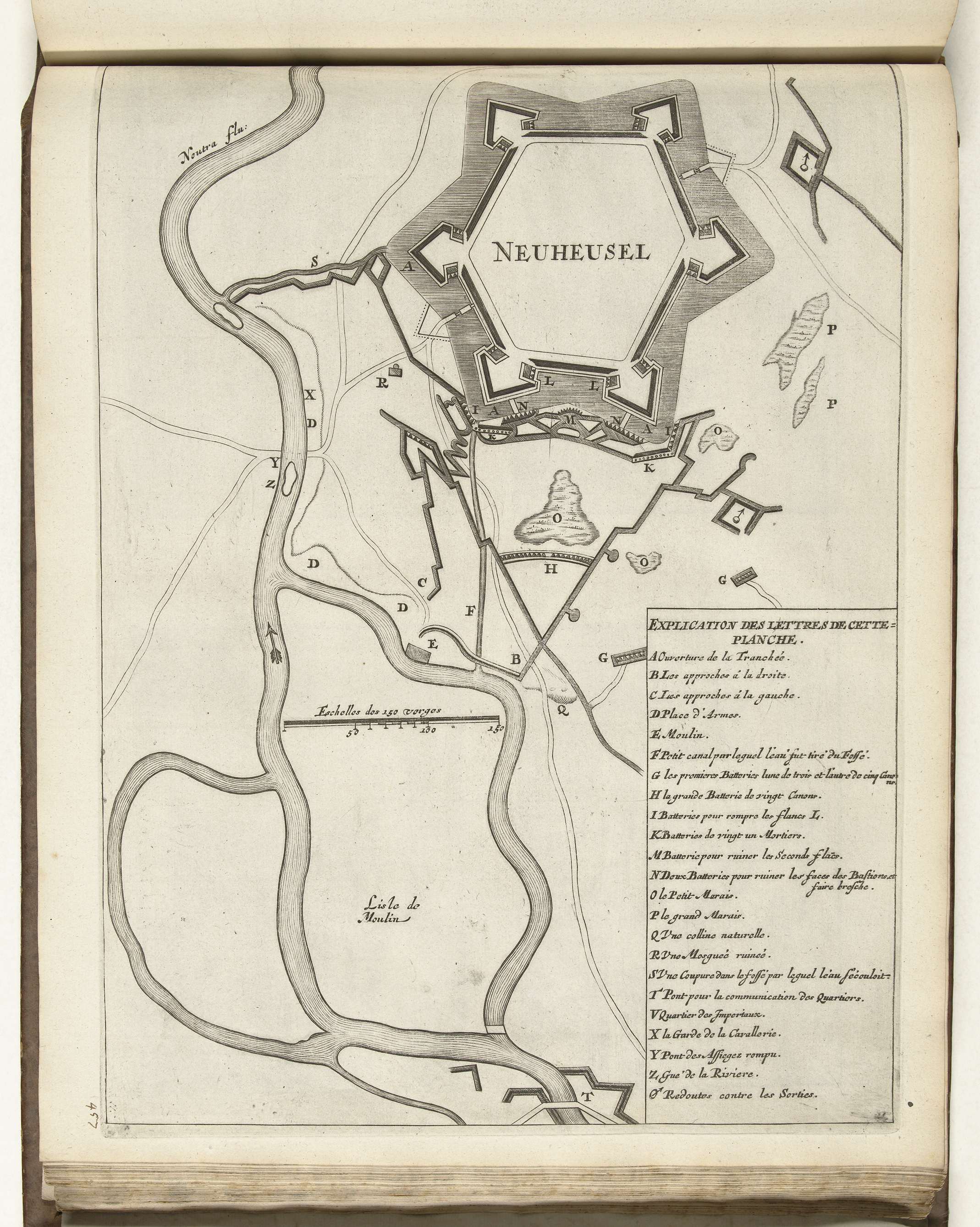 Plattegrond van de versterkingen om de Slowaakse stad Neuhäusel. Plaat nr. 457 in deel XVIII van het prentwerk: Les Forces de l'Europe, Asie, Afrique et Amerique ... Comme aussi les Cartes des Côtes de France et d'Espagne uit 1726, dit tweede deel met 271 met de hand genummerde platen van vermaarde sterke steden en vestingen ...
