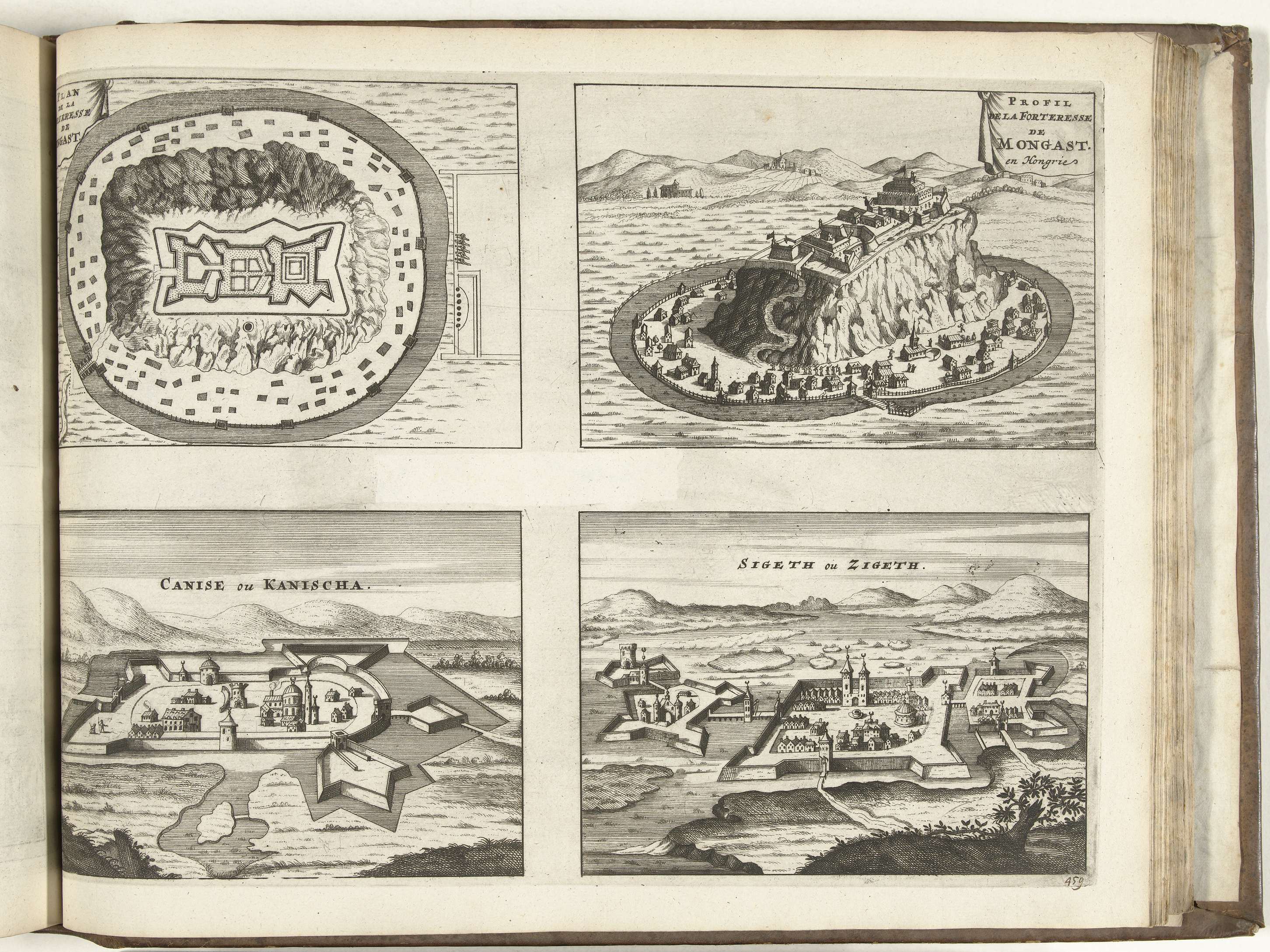 Blad met vier gezichten op Oost-Europese steden. Plattegrond van en gezicht op de vesting Munkács of Mongats (Mukachevo) in Boven-Hongarije, het huidige Oekraïne en twee gezichten op Kanischa en Sziget. Plaat nr. 459 in deel XVIII van het prentwerk: Les Forces de l'Europe, Asie, Afrique et Amerique ... Comme aussi les Cartes des Côtes de ...