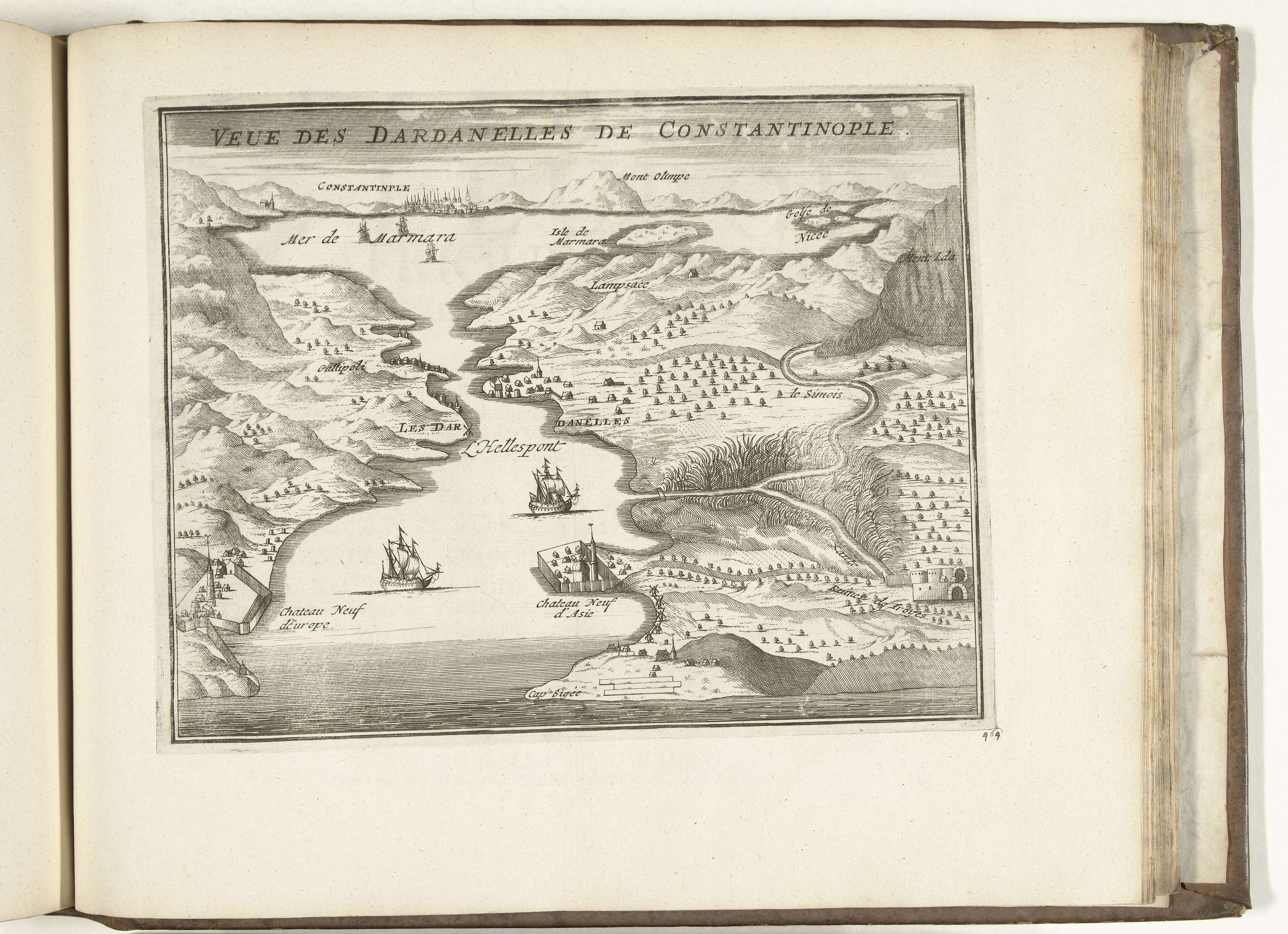 Gezicht op de zeestraat de Dardanellen (Hellespont) met in de verte de Turkse stad Constantinopel. Plaat nr. 464 in deel XVIII van het prentwerk: Les Forces de l'Europe, Asie, Afrique et Amerique ... Comme aussi les Cartes des Côtes de France et d'Espagne uit 1726, dit tweede deel met 271 met de hand genummerde platen ...
