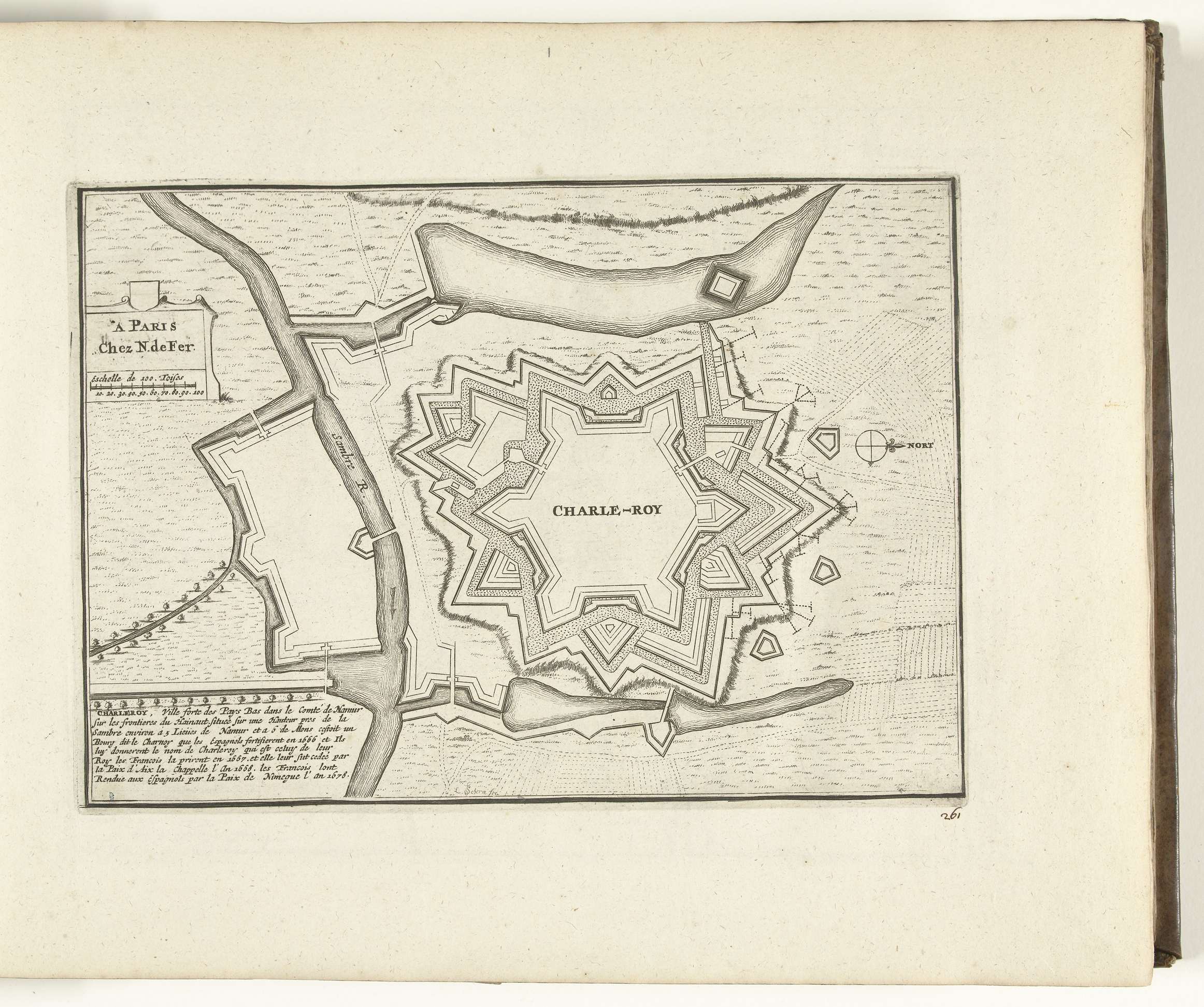 Plattegrond van de verdedigingswerken om de stad Charleroi. Plaat nr. 261 in deel XI van het prentwerk: Les Forces de l'Europe, Asie, Afrique et Amerique ... Comme aussi les Cartes des Côtes de France et d'Espagne uit 1726, dit tweede deel met 271 met de hand genummerde platen van vermaarde sterke steden en vestingen in ...