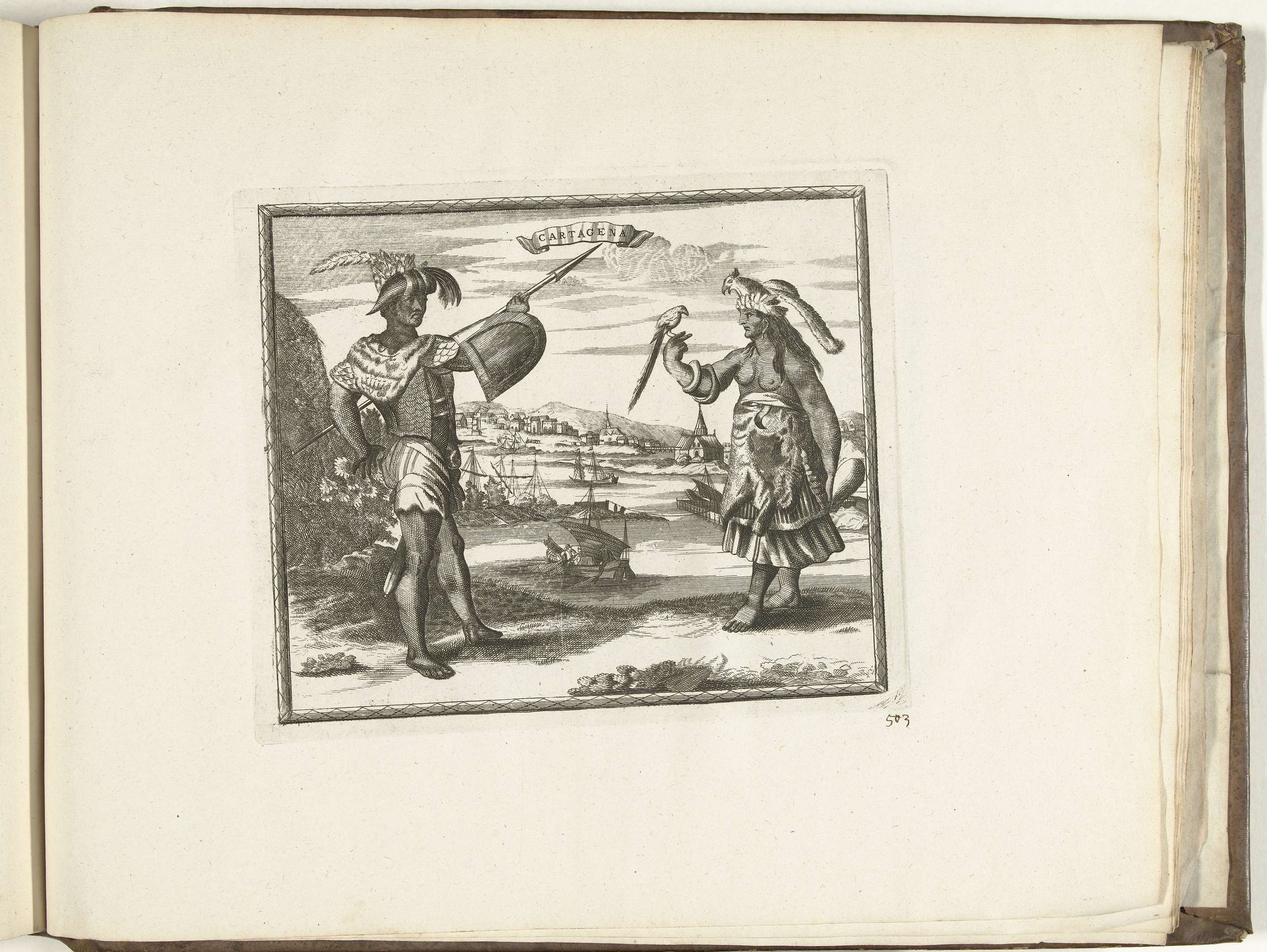 Man en vrouw uit Cartagena in Colombia, gekleed in lokaal kostuum, op de achtergrond de stad. Plaat nr. 503 in deel XX van het prentwerk: Les Forces de l'Europe, Asie, Afrique et Amerique ... Comme aussi les Cartes des Côtes de France et d'Espagne uit 1726, dit tweede deel met 271 met de hand genummerde ...