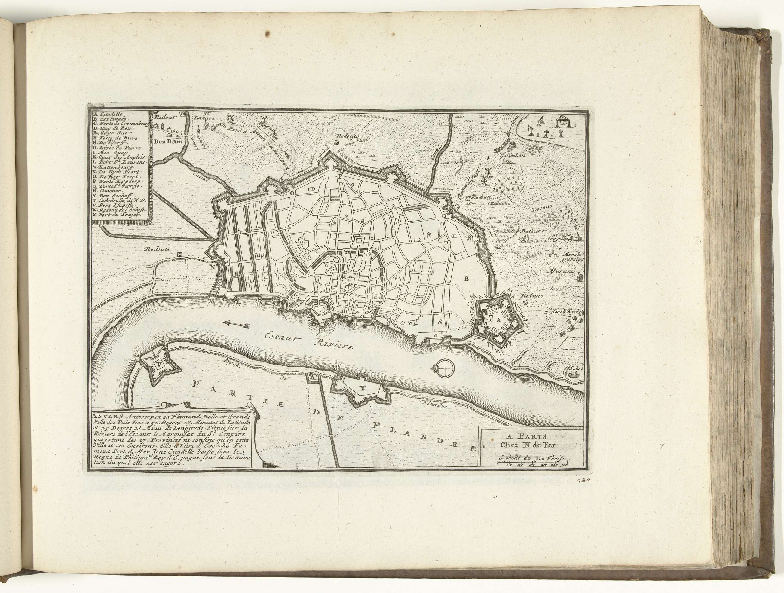 Plattegrond van de verdedigingswerken om de stad Antwerpen. Plaat nr. 280 in deel XII van het prentwerk: Les Forces de l'Europe, Asie, Afrique et Amerique ... Comme aussi les Cartes des Côtes de France et d'Espagne uit 1726, dit tweede deel met 271 met de hand genummerde platen van vermaarde sterke steden en vestingen in ...