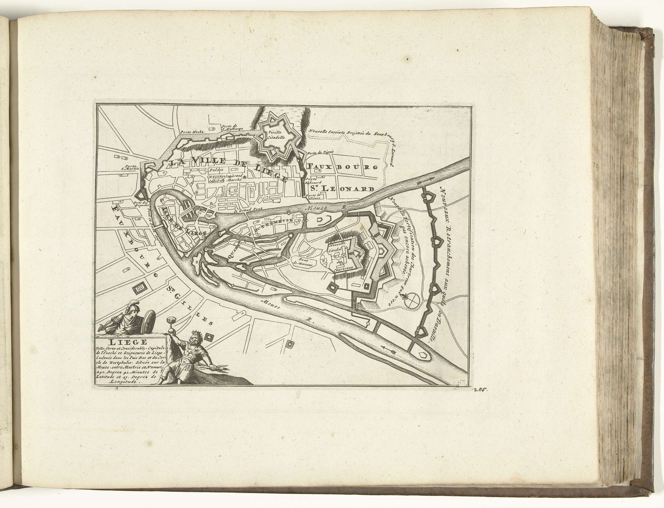 Plattegrond van de verdedigingswerken om Luik. Plaat nr. 285 in deel XII van het prentwerk: Les Forces de l'Europe, Asie, Afrique et Amerique ... Comme aussi les Cartes des Côtes de France et d'Espagne uit 1726, dit tweede deel met 271 met de hand genummerde platen van vermaarde sterke steden en vestingen in het kader ...
