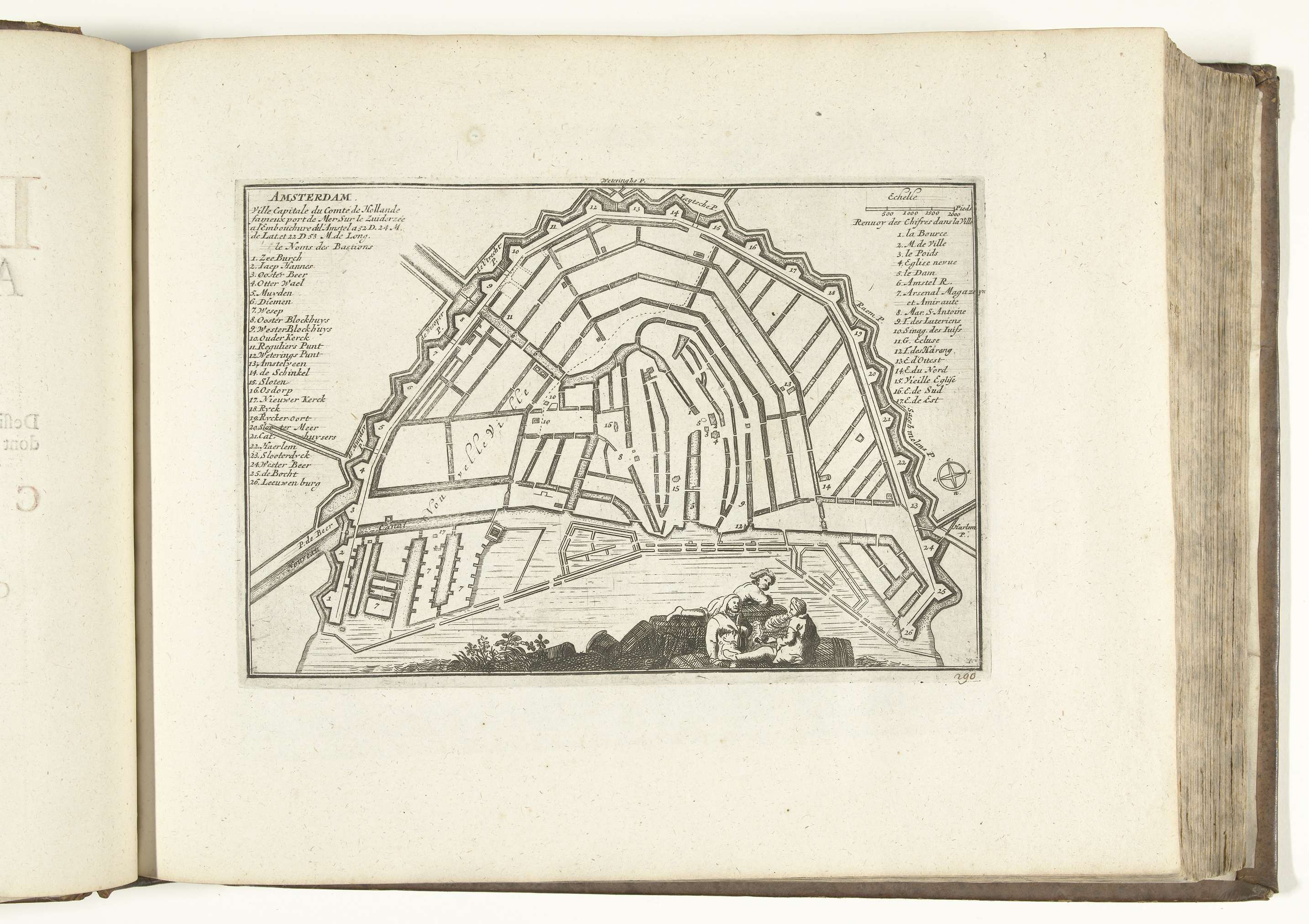 Plattegrond van de verdedigingswerken om Amsterdam. Plaat nr. 290 in deel XIII van het prentwerk: Les Forces de l'Europe, Asie, Afrique et Amerique ... Comme aussi les Cartes des Côtes de France et d'Espagne uit 1726, dit tweede deel met 271 met de hand genummerde platen van vermaarde sterke steden en vestingen in het kader ...