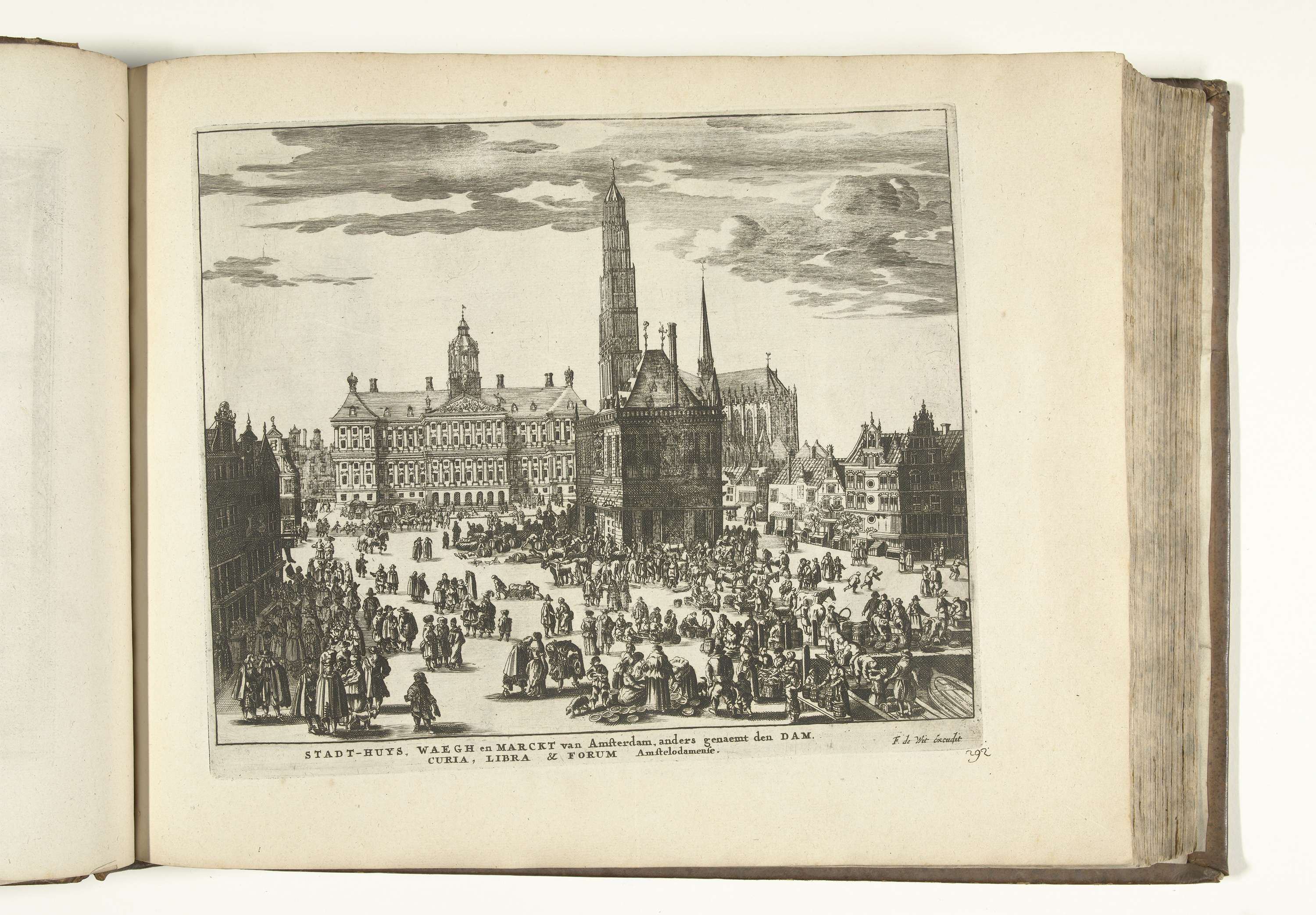Gezicht op het Stadhuis, de Waag en de markt op de Dam te Amsterdam. Plaat nr. 292 in deel XIII van het prentwerk: Les Forces de l'Europe, Asie, Afrique et Amerique ... Comme aussi les Cartes des Côtes de France et d'Espagne uit 1726, dit tweede deel met 271 met de hand genummerde platen van ...