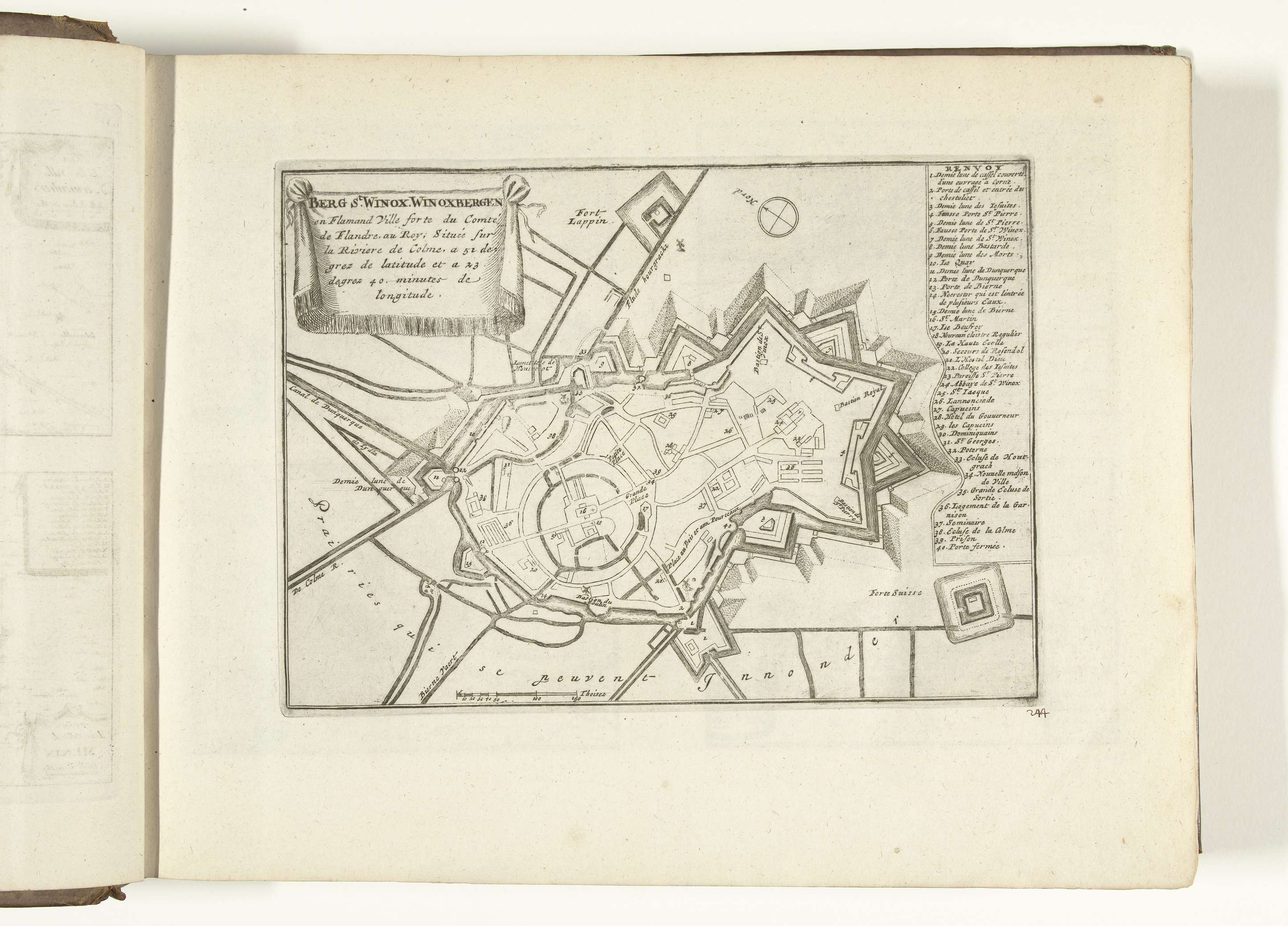 Plattegrond van de versterkingen om de Vlaamse (nu Franse) stad Sint-Winoksbergen (Bergues). Plaat nr. 244 in deel XI van het prentwerk: Les Forces de l'Europe, Asie, Afrique et Amerique ... Comme aussi les Cartes des Côtes de France et d'Espagne uit 1726, dit tweede deel met 271 met de hand genummerde platen van vermaarde sterke ...