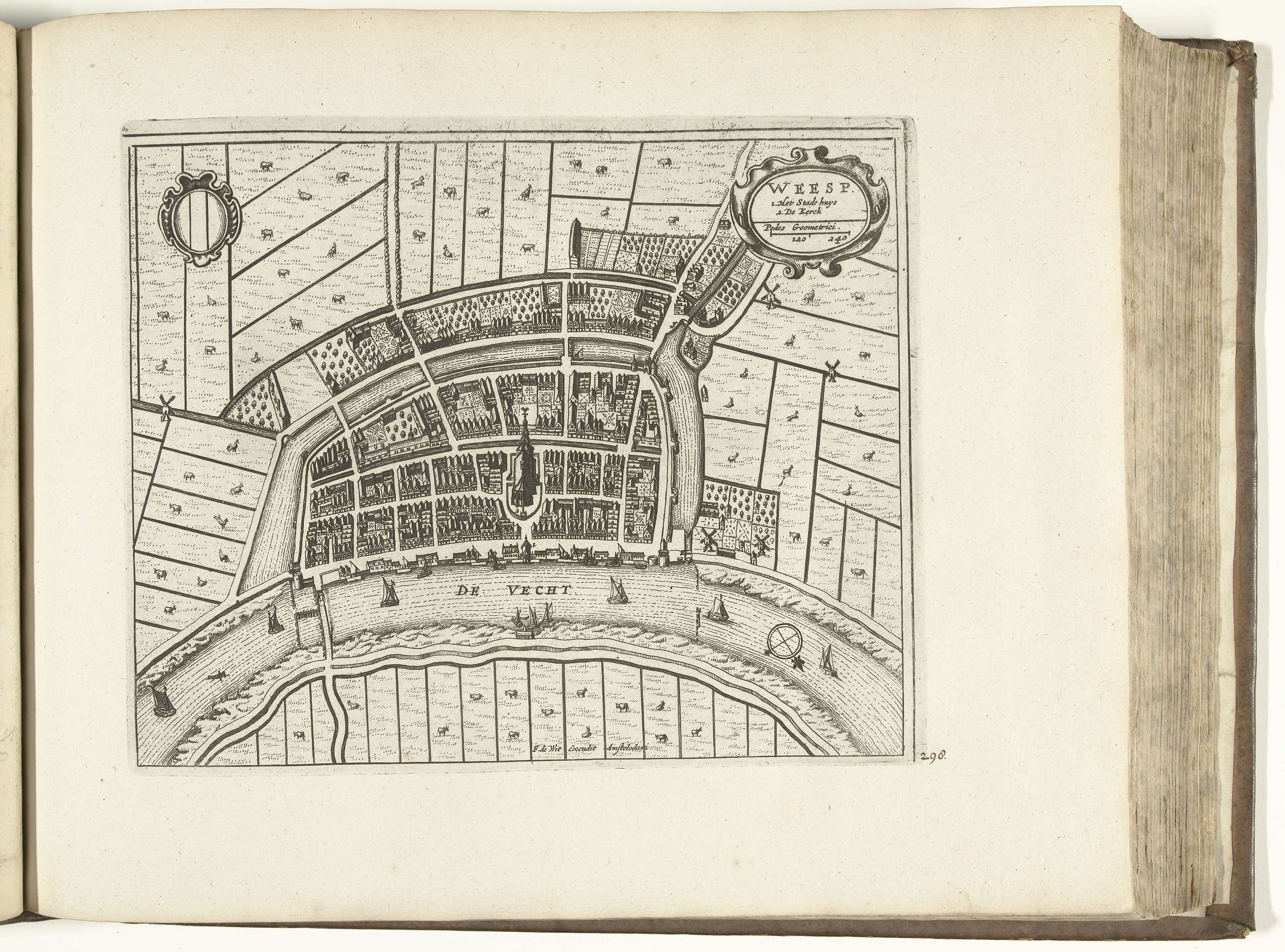 Plattegrond van de stad Weesp. Plaat nr. 298 in deel XIII van het prentwerk: Les Forces de l'Europe, Asie, Afrique et Amerique ... Comme aussi les Cartes des Côtes de France et d'Espagne uit 1726, dit tweede deel met 271 met de hand genummerde platen van vermaarde sterke steden en vestingen in het kader van ...