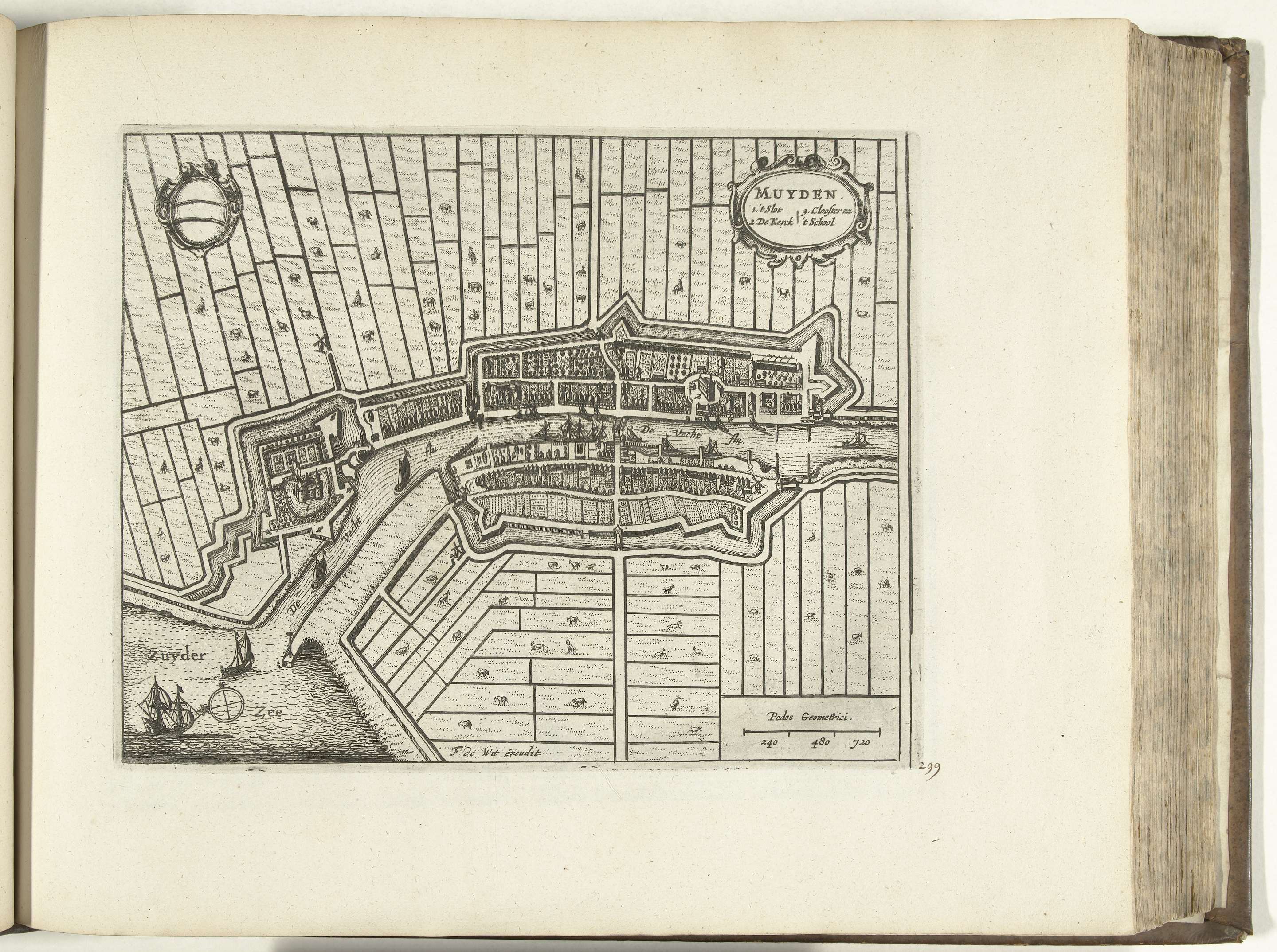 Plattegrond van de stad Muiden. Plaat nr. 299 in deel XIII van het prentwerk: Les Forces de l'Europe, Asie, Afrique et Amerique ... Comme aussi les Cartes des Côtes de France et d'Espagne uit 1726, dit tweede deel met 271 met de hand genummerde platen van vermaarde sterke steden en vestingen in het kader van ...
