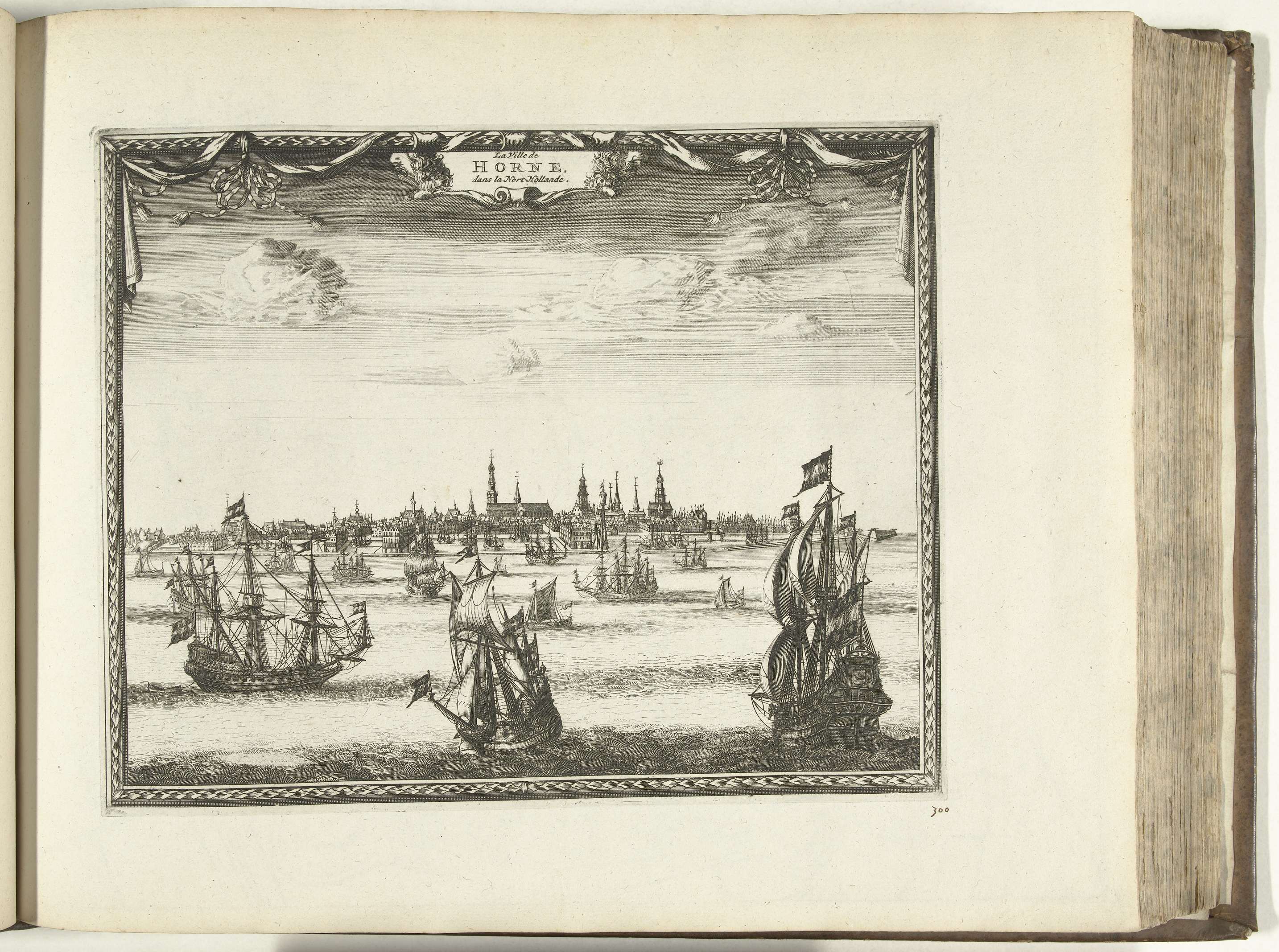 Gezicht op Hoorn, op de voorgrond schepen schepen voor de haven. Plaat nr. 300 in deel XIII van het prentwerk: Les Forces de l'Europe, Asie, Afrique et Amerique ... Comme aussi les Cartes des Côtes de France et d'Espagne uit 1726, dit tweede deel met 271 met de hand genummerde platen van vermaarde sterke steden ...