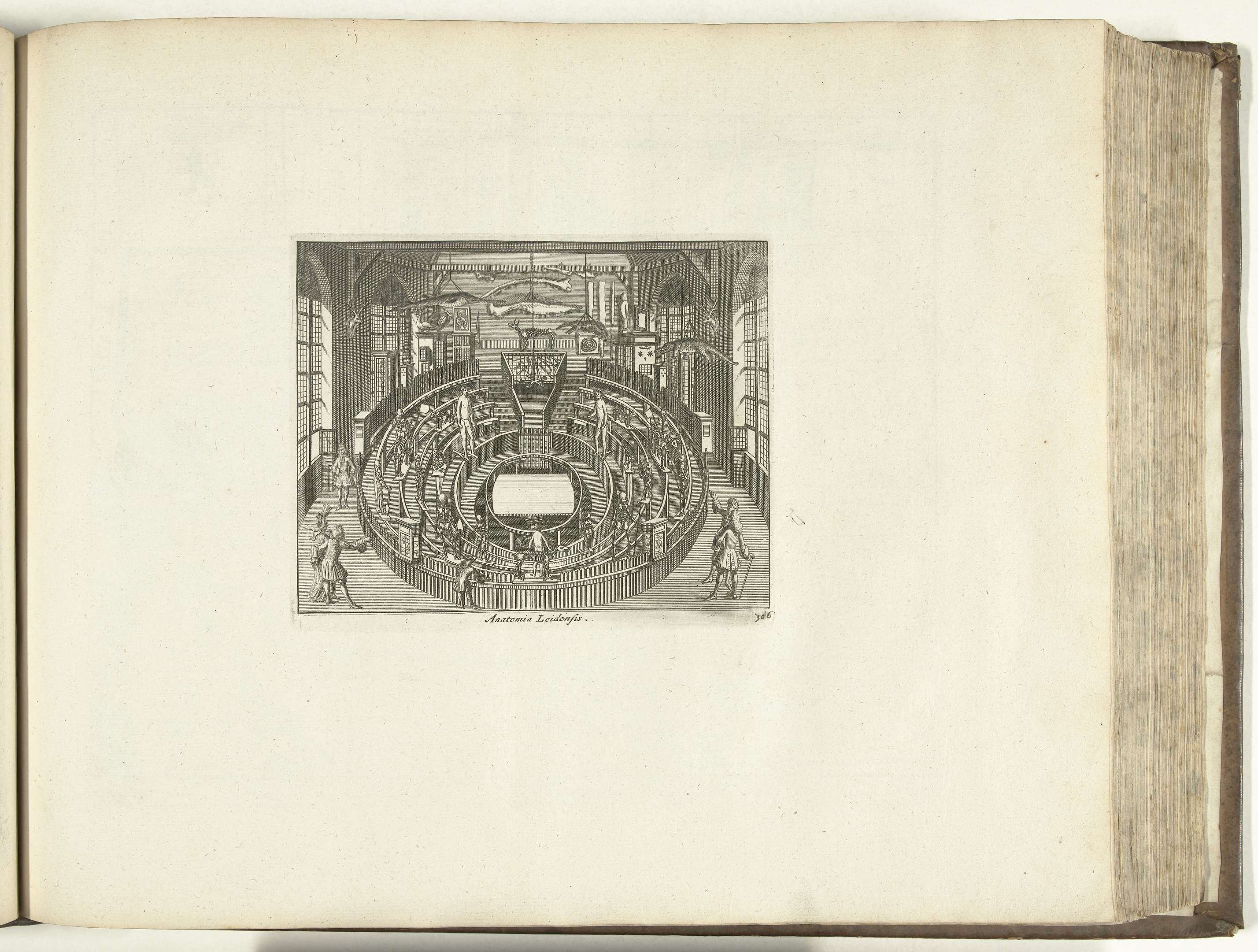 Gezicht op de Anatomiezaal van de Universiteit van Leiden. Plaat nr. 306 in deel XIII van het prentwerk: Les Forces de l'Europe, Asie, Afrique et Amerique ... Comme aussi les Cartes des Côtes de France et d'Espagne uit 1726, dit tweede deel met 271 met de hand genummerde platen van vermaarde sterke steden en vestingen ...