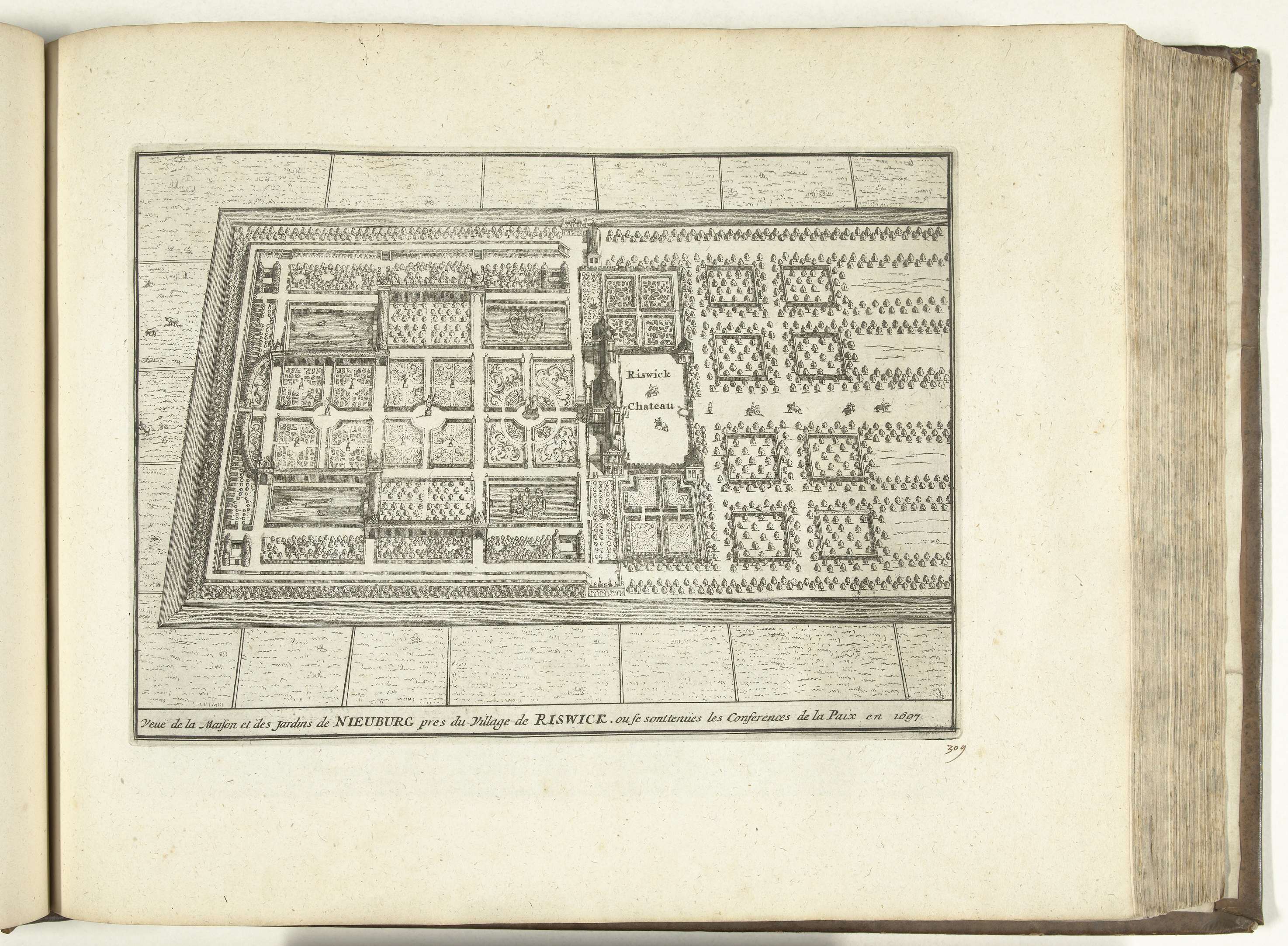 Plattegrond van het Huis ter Nieuburch met tuinen bij Rijswijk waar in 1697 de vrede getekend werd. Plaat nr. 309 in deel XIII van het prentwerk: Les Forces de l'Europe, Asie, Afrique et Amerique ... Comme aussi les Cartes des Côtes de France et d'Espagne uit 1726, dit tweede deel met 271 met de hand ...