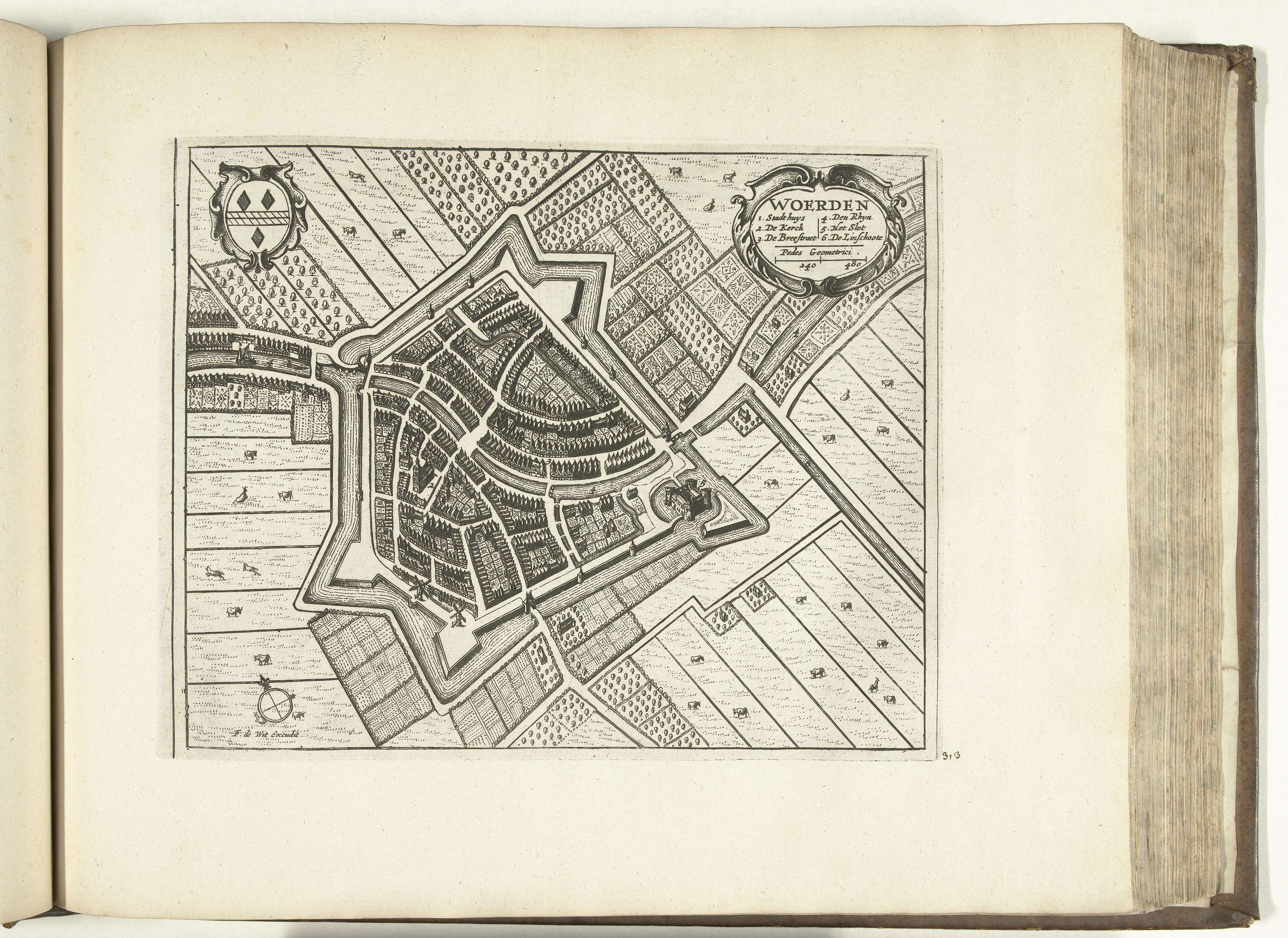 Plattegrond van Woerden. Plaat nr. 313 in deel XIII van het prentwerk: Les Forces de l'Europe, Asie, Afrique et Amerique ... Comme aussi les Cartes des Côtes de France et d'Espagne uit 1726, dit tweede deel met 271 met de hand genummerde platen van vermaarde sterke steden en vestingen in het kader van de Spaanse ...