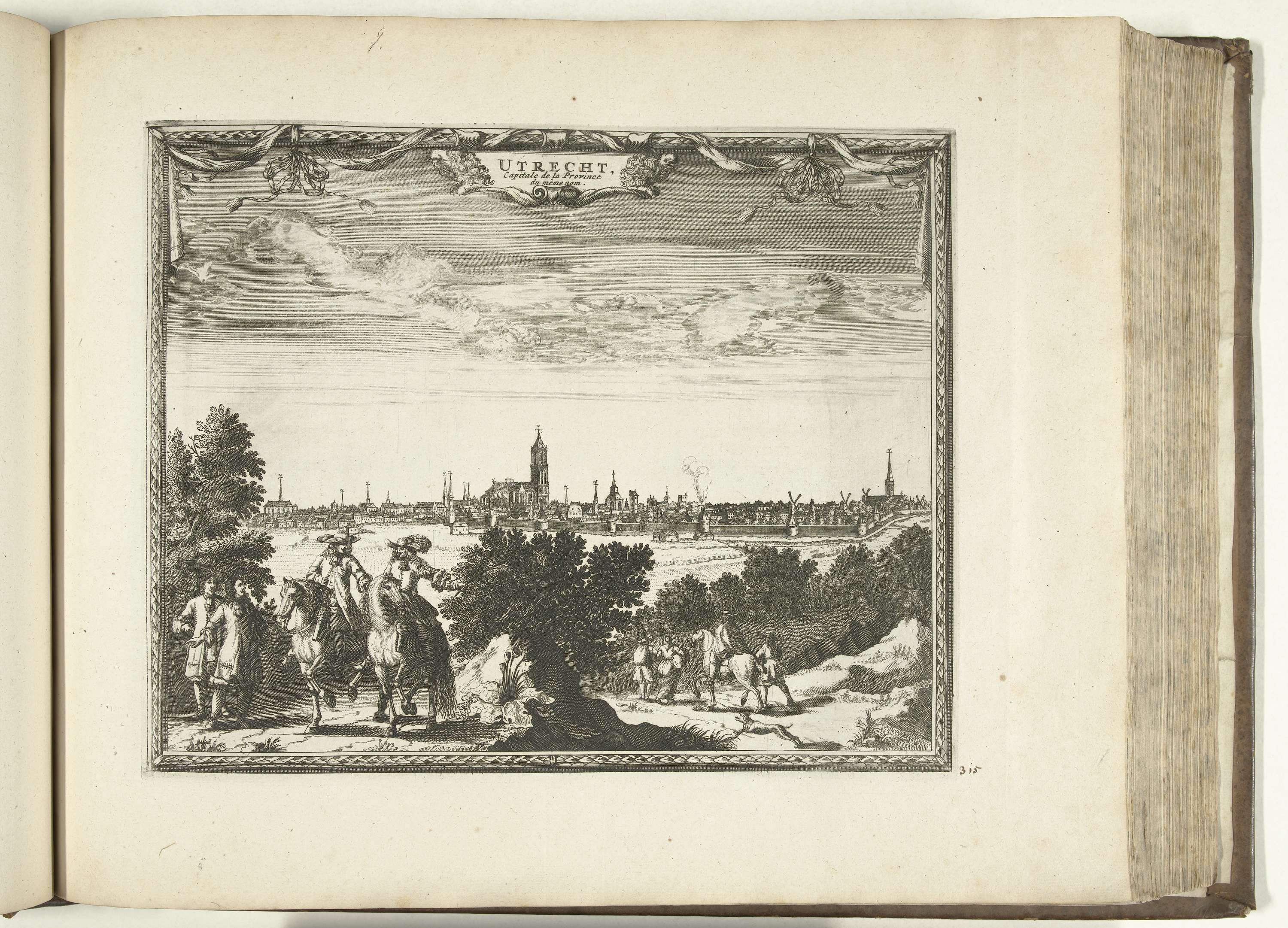 Gezicht op Utrecht, op de voorgrond enkele wandelaars en ruiters. Plaat nr. 315 in deel XIII van het prentwerk: Les Forces de l'Europe, Asie, Afrique et Amerique ... Comme aussi les Cartes des Côtes de France et d'Espagne uit 1726, dit tweede deel met 271 met de hand genummerde platen van vermaarde sterke steden en ...