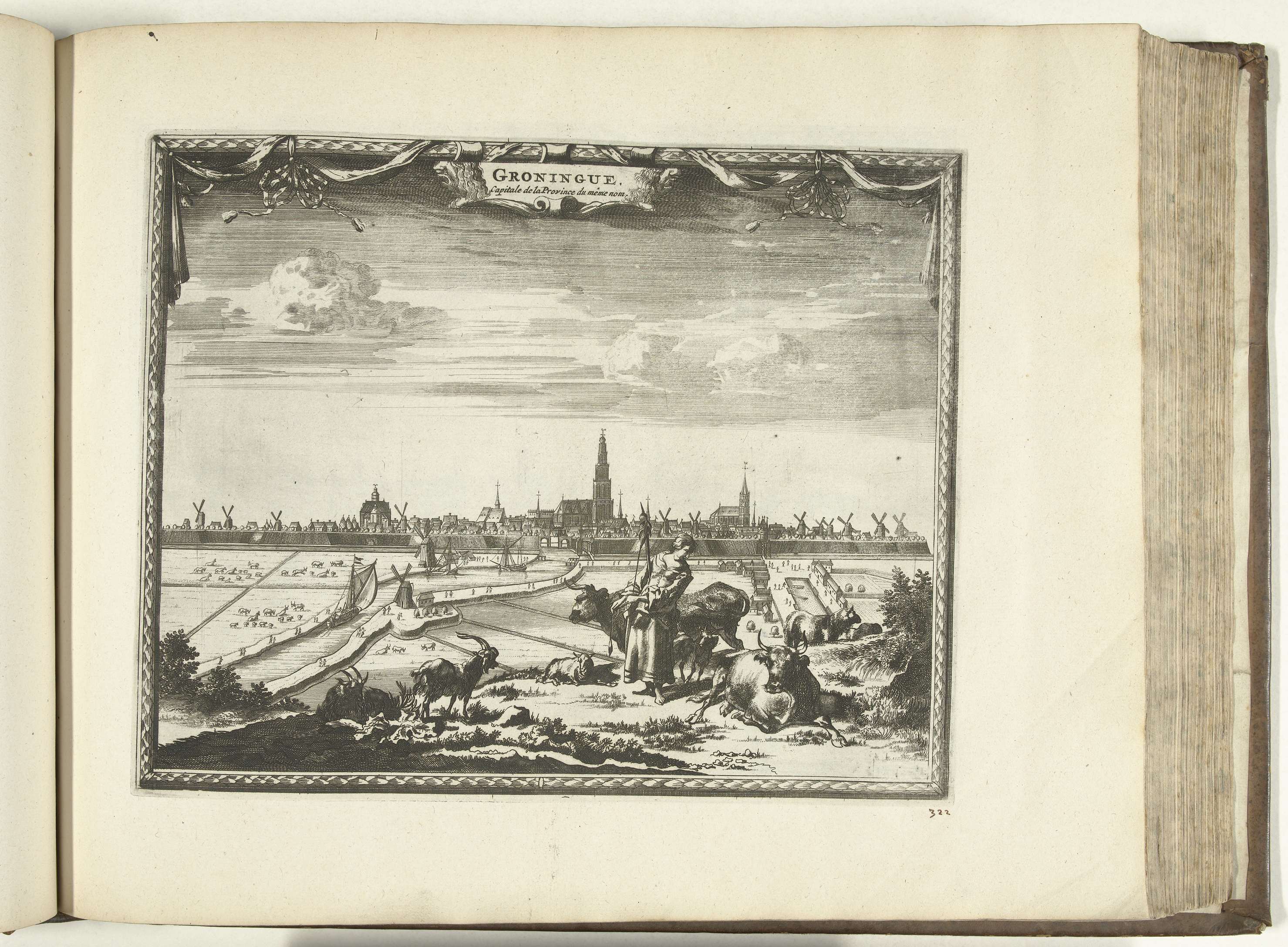Gezicht op Groningen, op de voorgrond een herderin met vee. Plaat nr. 322 in deel XIII van het prentwerk: Les Forces de l'Europe, Asie, Afrique et Amerique ... Comme aussi les Cartes des Côtes de France et d'Espagne uit 1726, dit tweede deel met 271 met de hand genummerde platen van vermaarde sterke steden en ...