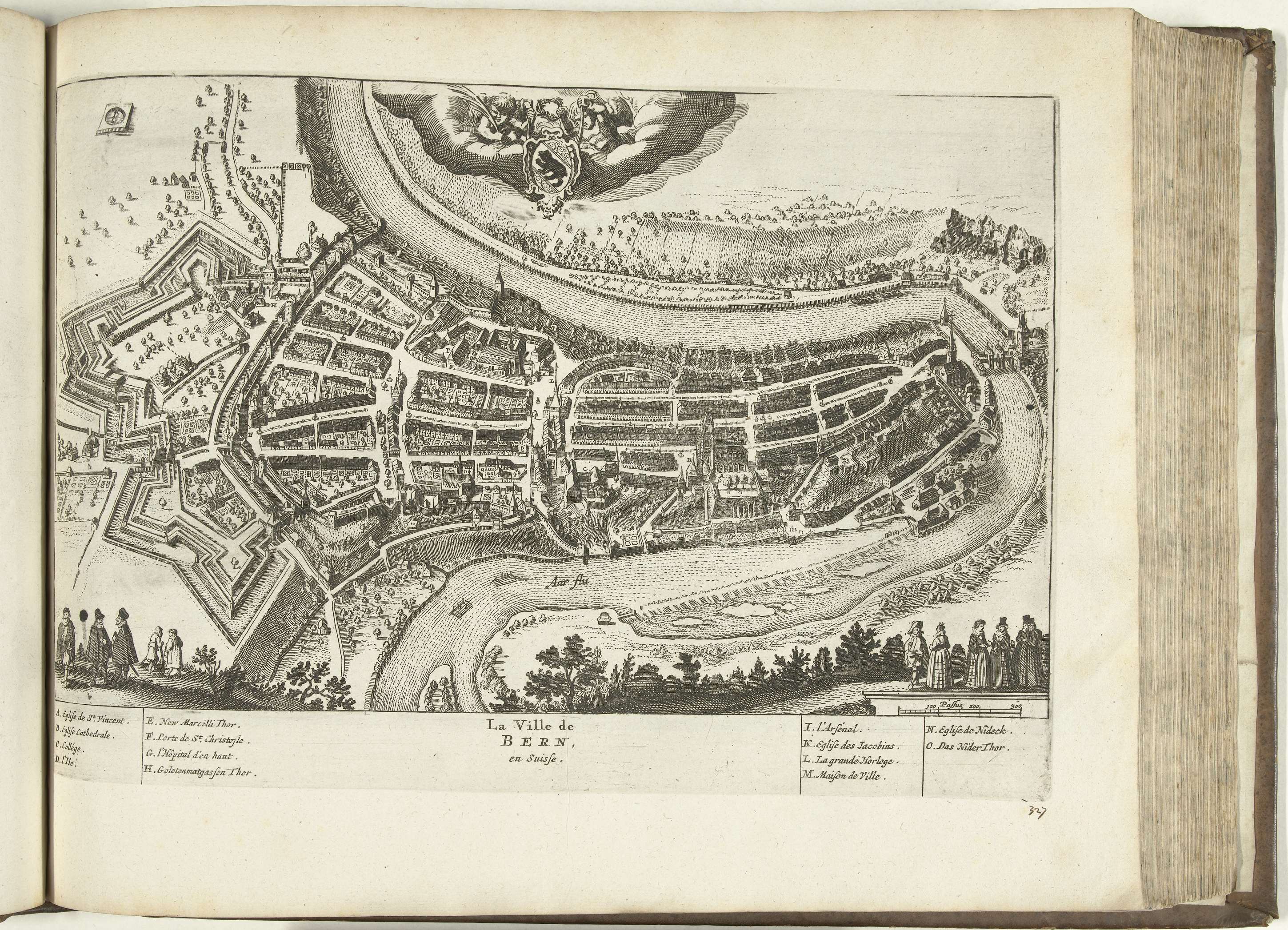 Plattegrond van Bern. Plaat nr. 327 in deel XIV van het prentwerk: Les Forces de l'Europe, Asie, Afrique et Amerique ... Comme aussi les Cartes des Côtes de France et d'Espagne uit 1726, dit tweede deel met 271 met de hand genummerde platen van vermaarde sterke steden en vestingen in het kader van de Spaanse ...