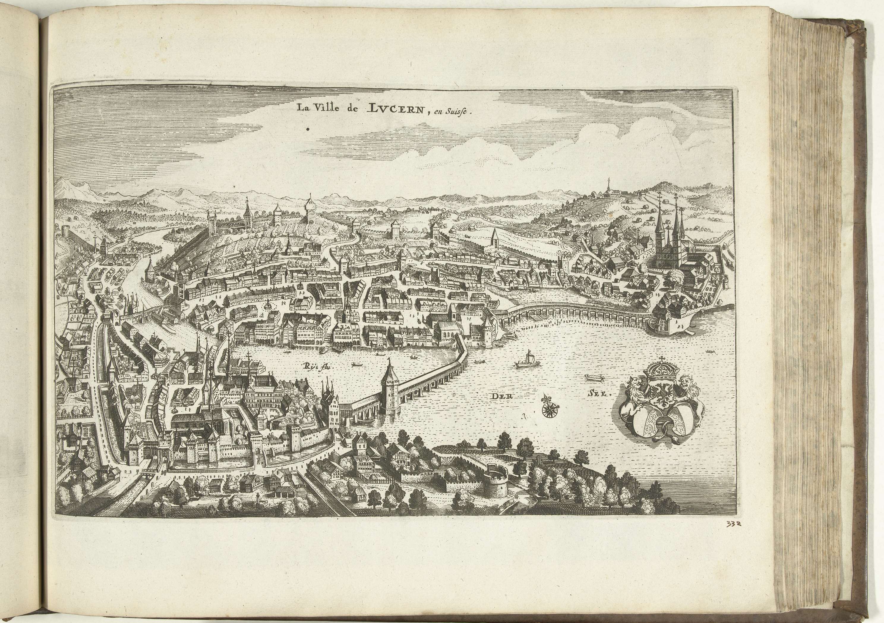 Gezicht op Luzern in Zwitserland. Plaat nr. 332 in deel XIV van het prentwerk: Les Forces de l'Europe, Asie, Afrique et Amerique ... Comme aussi les Cartes des Côtes de France et d'Espagne uit 1726, dit tweede deel met 271 met de hand genummerde platen van vermaarde sterke steden en vestingen in het kader van ...