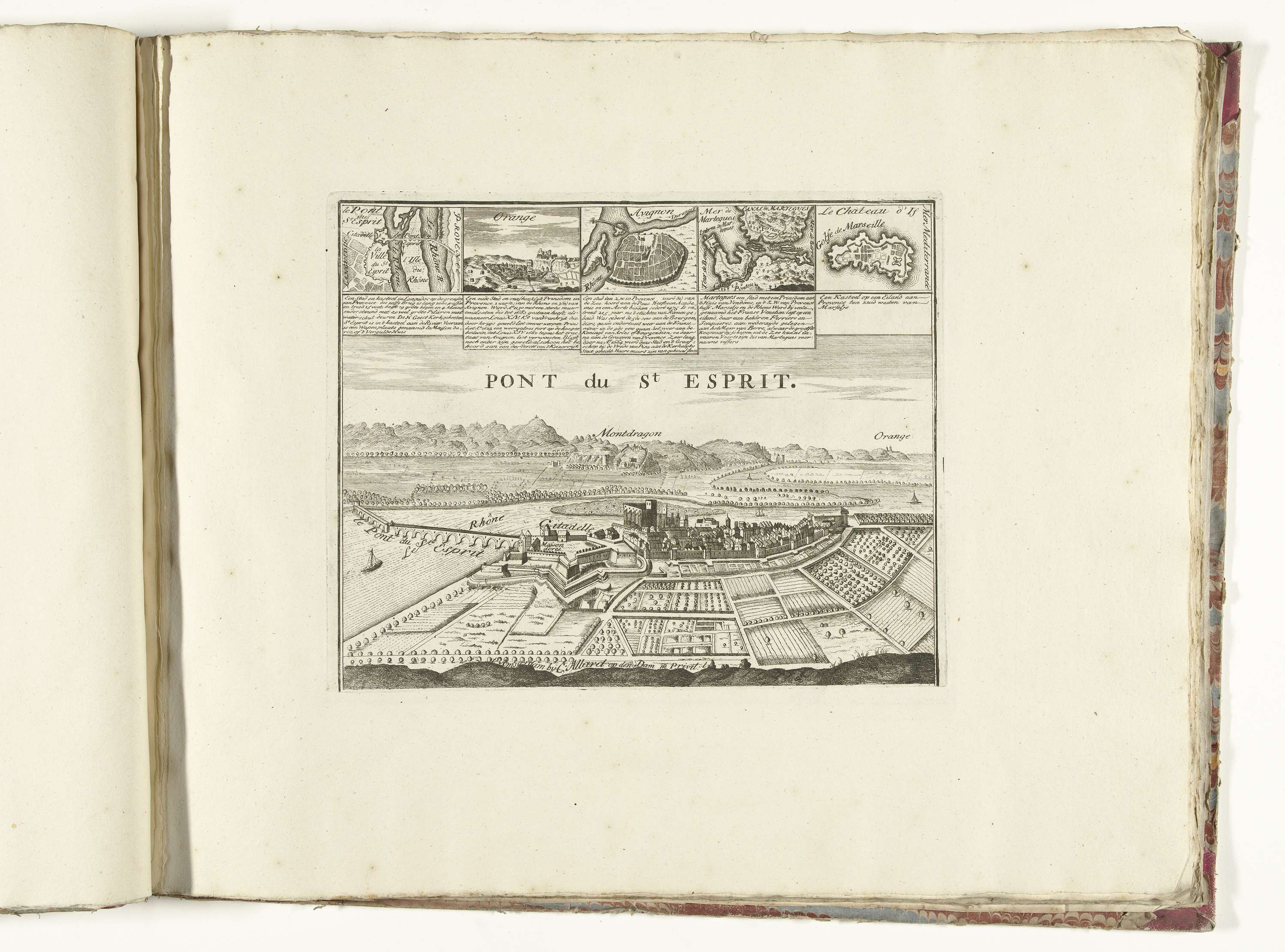 Gezicht op Pont-Saint-Esprit met de brug over de Rhône, bovenaan vijf kleine plaatjes van andere Franse steden. Onderdeel van de gebundelde reeks van 49 platen van vermaarde sterke steden en vestingen in de Spaanse Successieoorlog, ca. 1701-1713. Met de titels in het Nederlands.