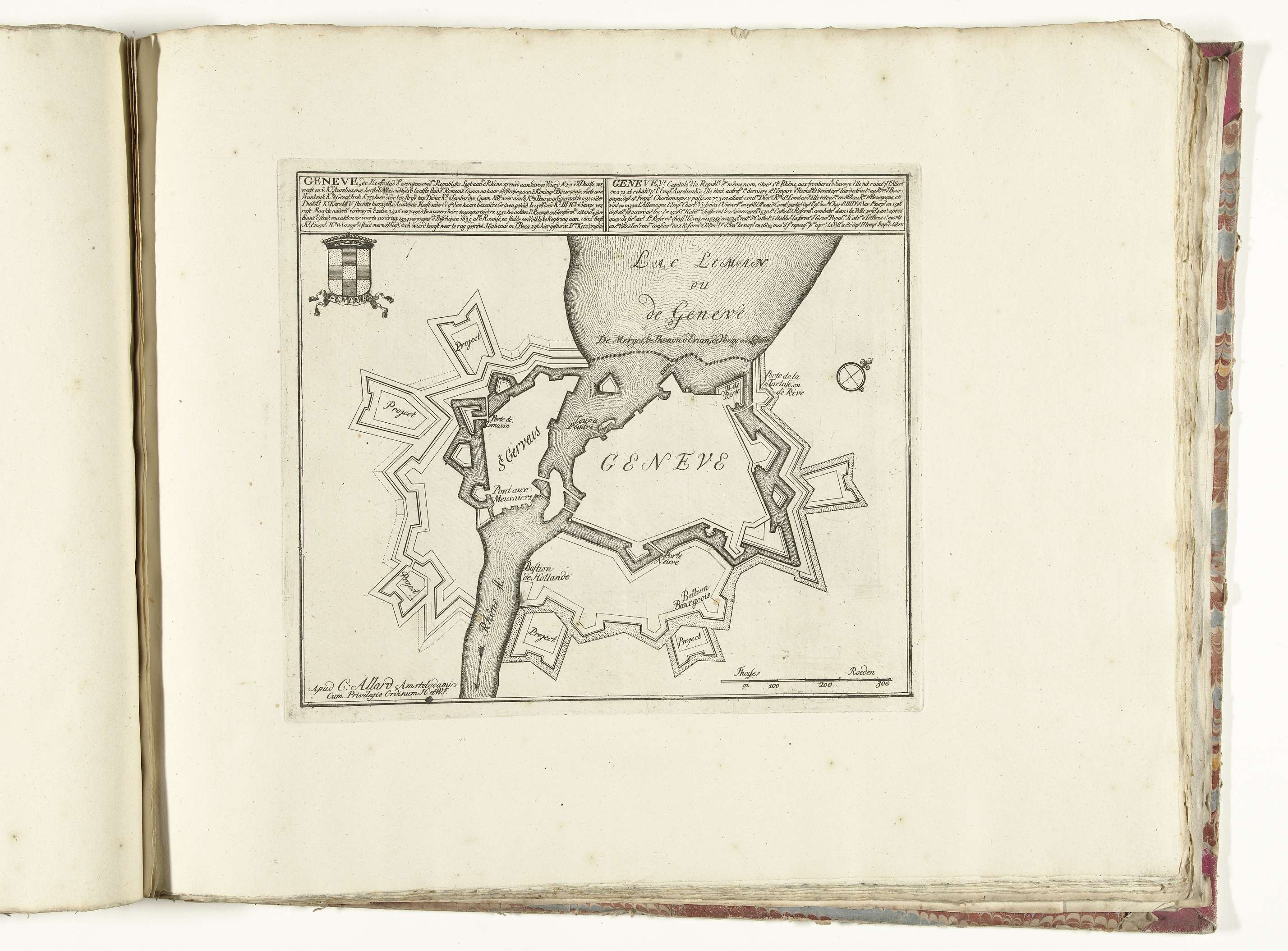 Plattegrond van de fortificaties rondom de stad Genève. Onderdeel van de gebundelde reeks van 49 platen van vermaarde sterke steden en vestingen in de Spaanse Successieoorlog, ca. 1701-1713. Met de titels in het Nederlands en Frans.