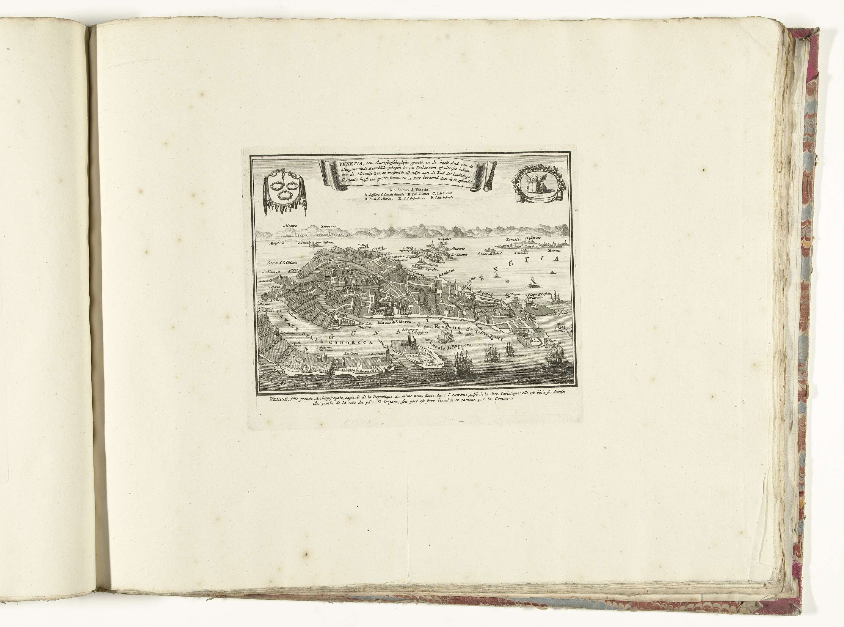 Plattegrond van Venetië, gezien in vogelvluchtperspectief. In de lucht twee wapens. Onderdeel van de gebundelde reeks van 49 platen van vermaarde sterke steden en vestingen in de Spaanse Successieoorlog, ca. 1701-1713. Met de titels in het Nederlands en Frans.