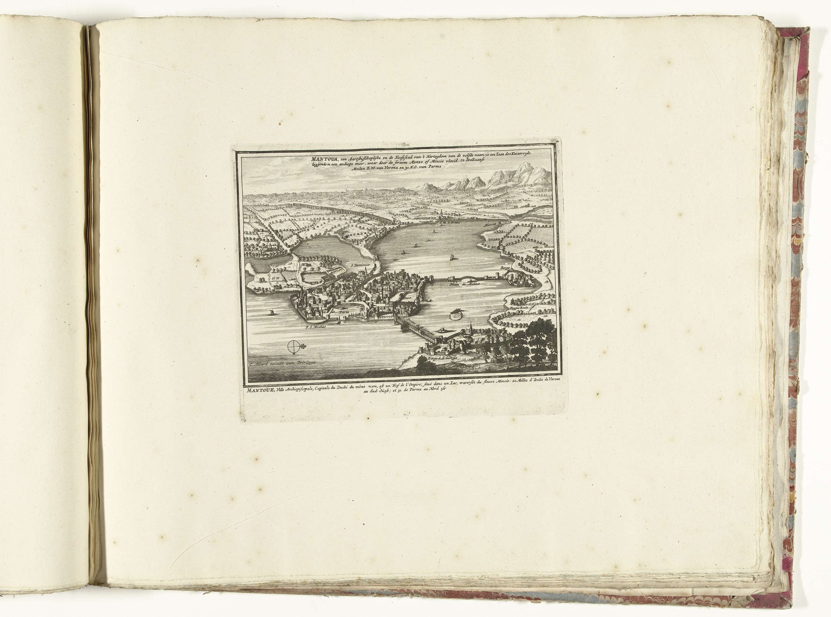 Mantua, gezien in vogelvluchtperspectief. Onderdeel van de gebundelde reeks van 49 platen van vermaarde sterke steden en vestingen in de Spaanse Successieoorlog, ca. 1701-1713. Met de titels in het Nederlands en Frans.