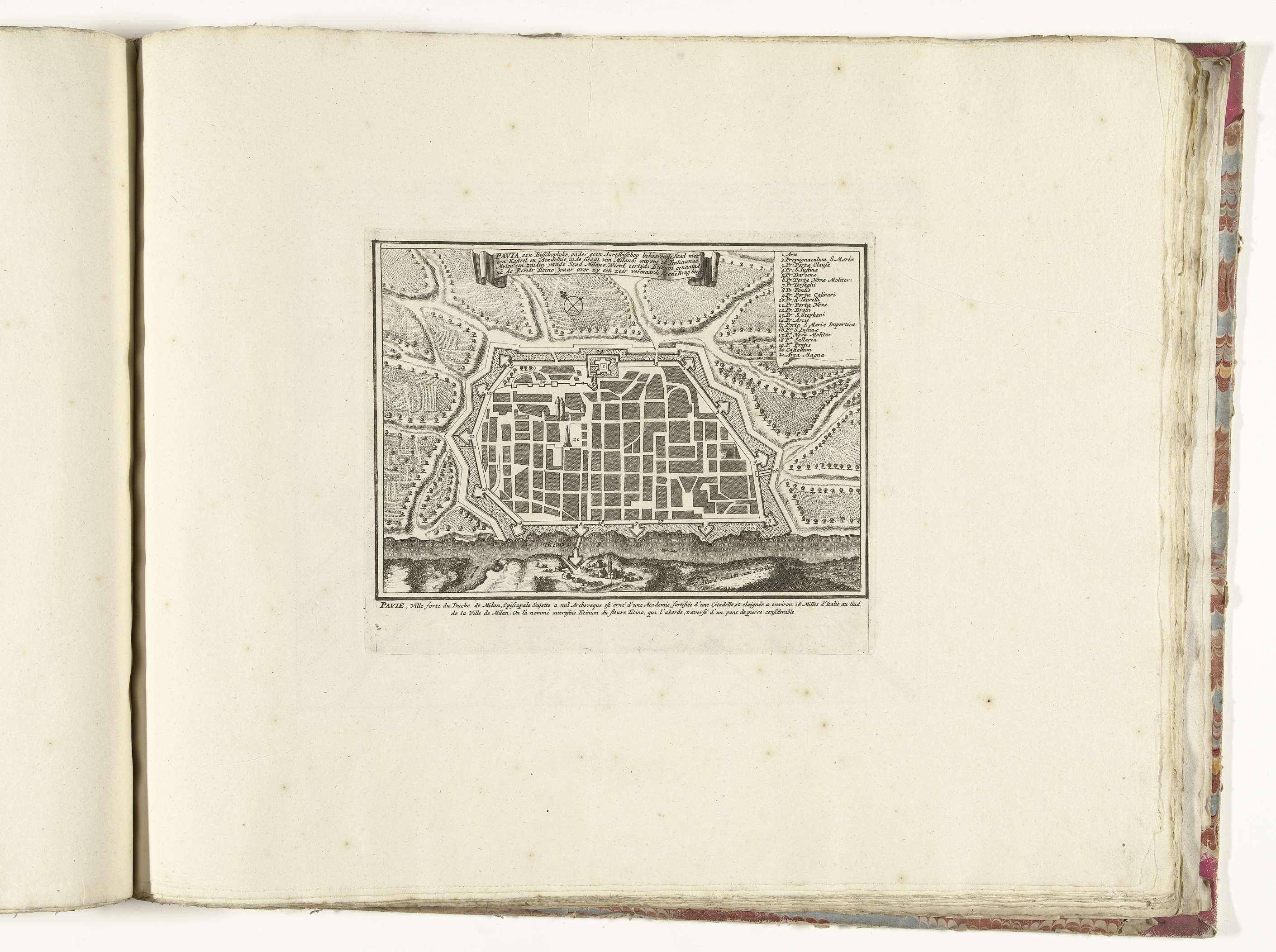 Plattegrond van de Italiaanse stad Pavia. Onderdeel van de gebundelde reeks van 49 platen van vermaarde sterke steden en vestingen in de Spaanse Successieoorlog, ca. 1701-1713. Met de titels in het Nederlands en Frans.