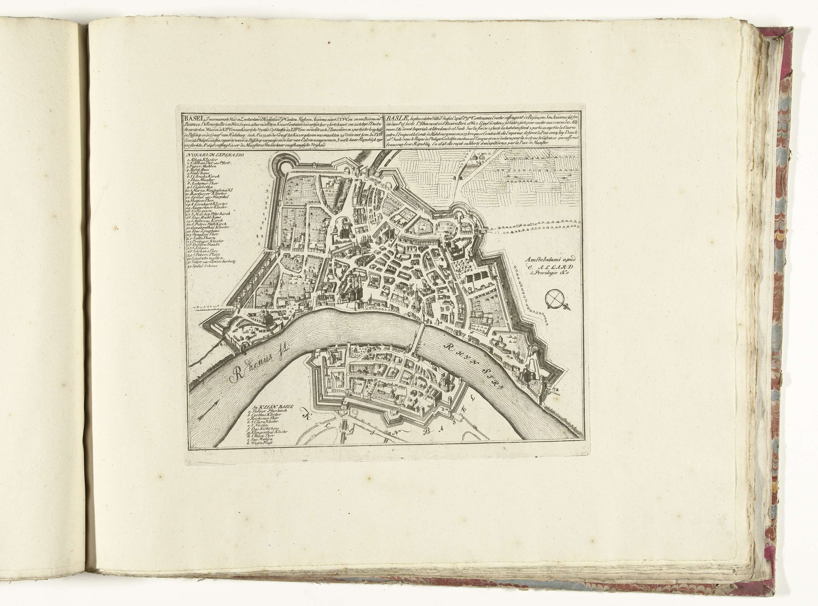 Plattegrond van de Zwitserse stad Basel, gelegen aan de Rijn. Onderdeel van de gebundelde reeks van 49 platen van vermaarde sterke steden en vestingen in de Spaanse Successieoorlog, ca. 1701-1713. Met de titels in het Nederlands en Frans.