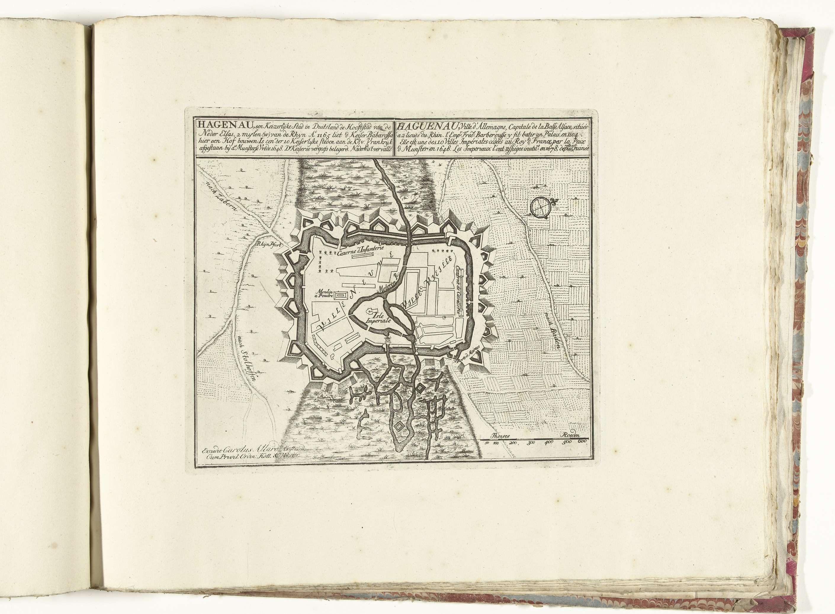 Plattegrond van de Duitse stad Haguenau in de Elzas. Onderdeel van de gebundelde reeks van 49 platen van vermaarde sterke steden en vestingen in de Spaanse Successieoorlog, ca. 1701-1713. Met de titels in het Nederlands en Frans.
