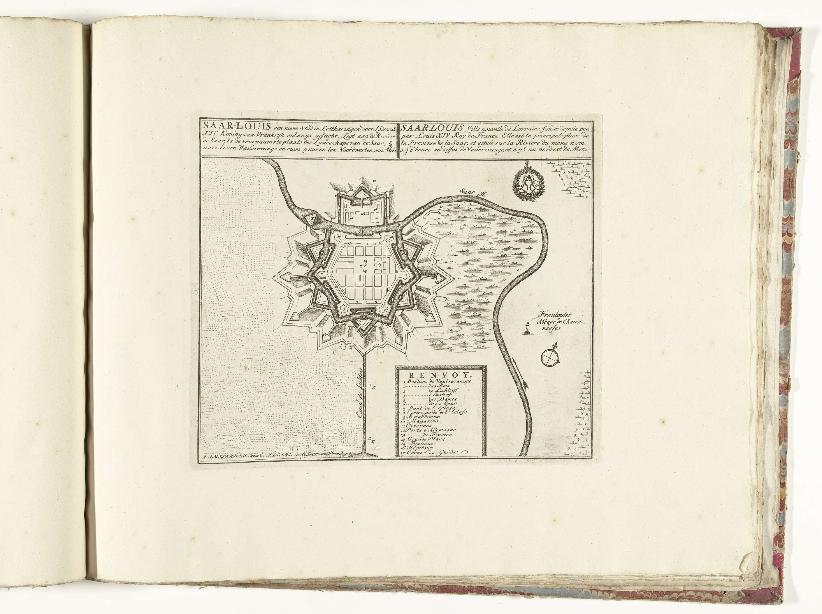 Plattegrond van de door Lodewijk XIV gestichte stad Saarlouis in Saarland. Onderdeel van de gebundelde reeks van 49 platen van vermaarde sterke steden en vestingen in de Spaanse Successieoorlog, ca. 1701-1713. Met de titels in het Nederlands en Frans.