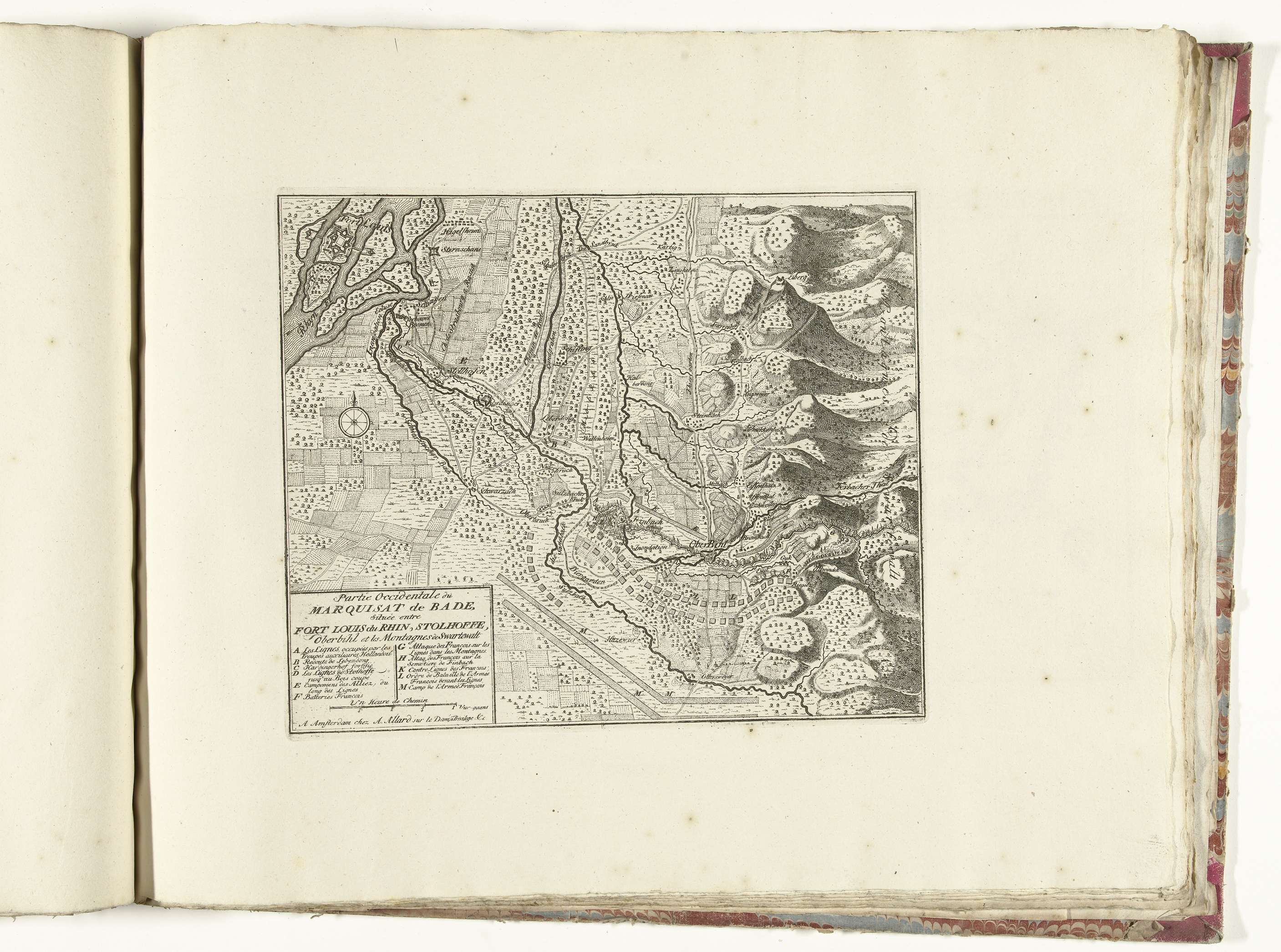 Kaart van het westen van de markizaat Baden waarop zijn aangegeven de linies van de Fransen en van de geallieerden en verschillende gevechten. Onderdeel van de gebundelde reeks van 49 platen van vermaarde sterke steden en vestingen in de Spaanse Successieoorlog, ca. 1701-1713. Met de titels in het Nederlands en Frans.