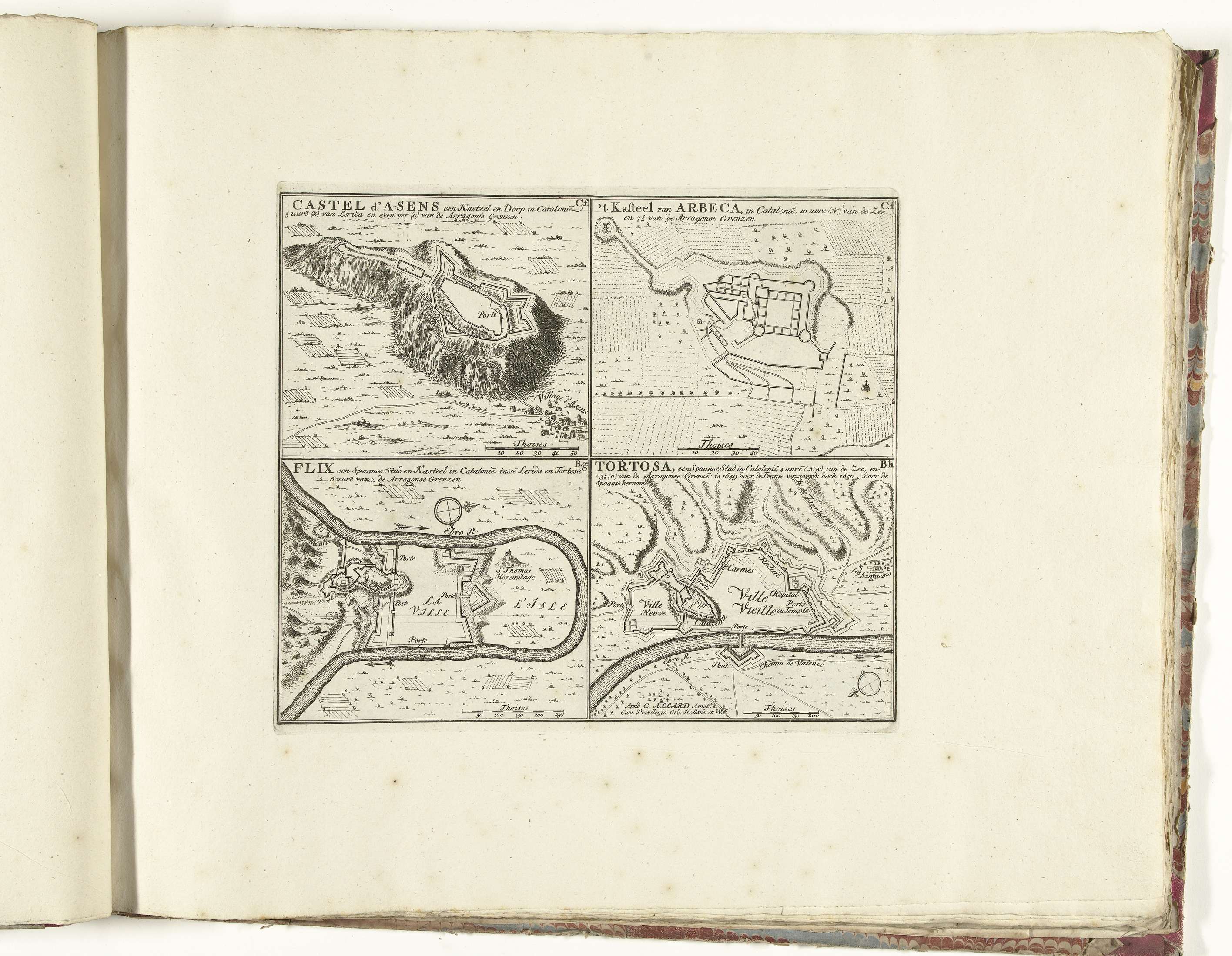 Blad met vier plattegronden van de versterkingen om Tortosa en andere plaatsen in Catalonië. Onderdeel van de gebundelde reeks van 49 platen van vermaarde sterke steden en vestingen in de Spaanse Successieoorlog, ca. 1701-1713. Met de titels in het Nederlands.