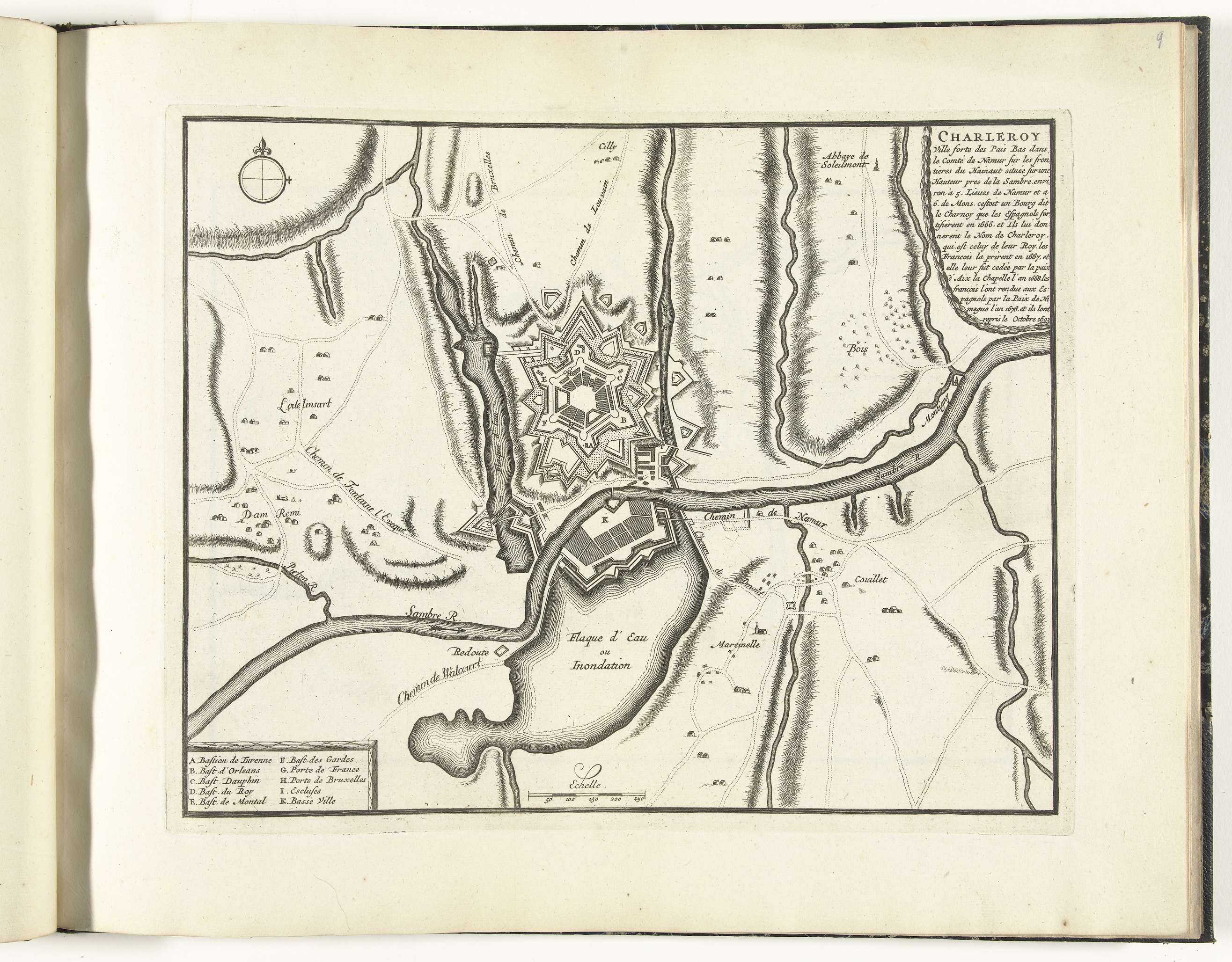 Plattegrond van de versterkingen om de stad Charleroi in de graafschap Namen. Maakt deel uit van het eerste deel van het prentwerk: Le Theatre de la Guerre, dans les Pays-Bas, uitgegeven in 1696. Dit deel bevat 25 platen met plannen (afkomstig van Sébastien Le Prestre, Seigneur de Vauban) van vermaarde sterke steden en vestingen in ...
