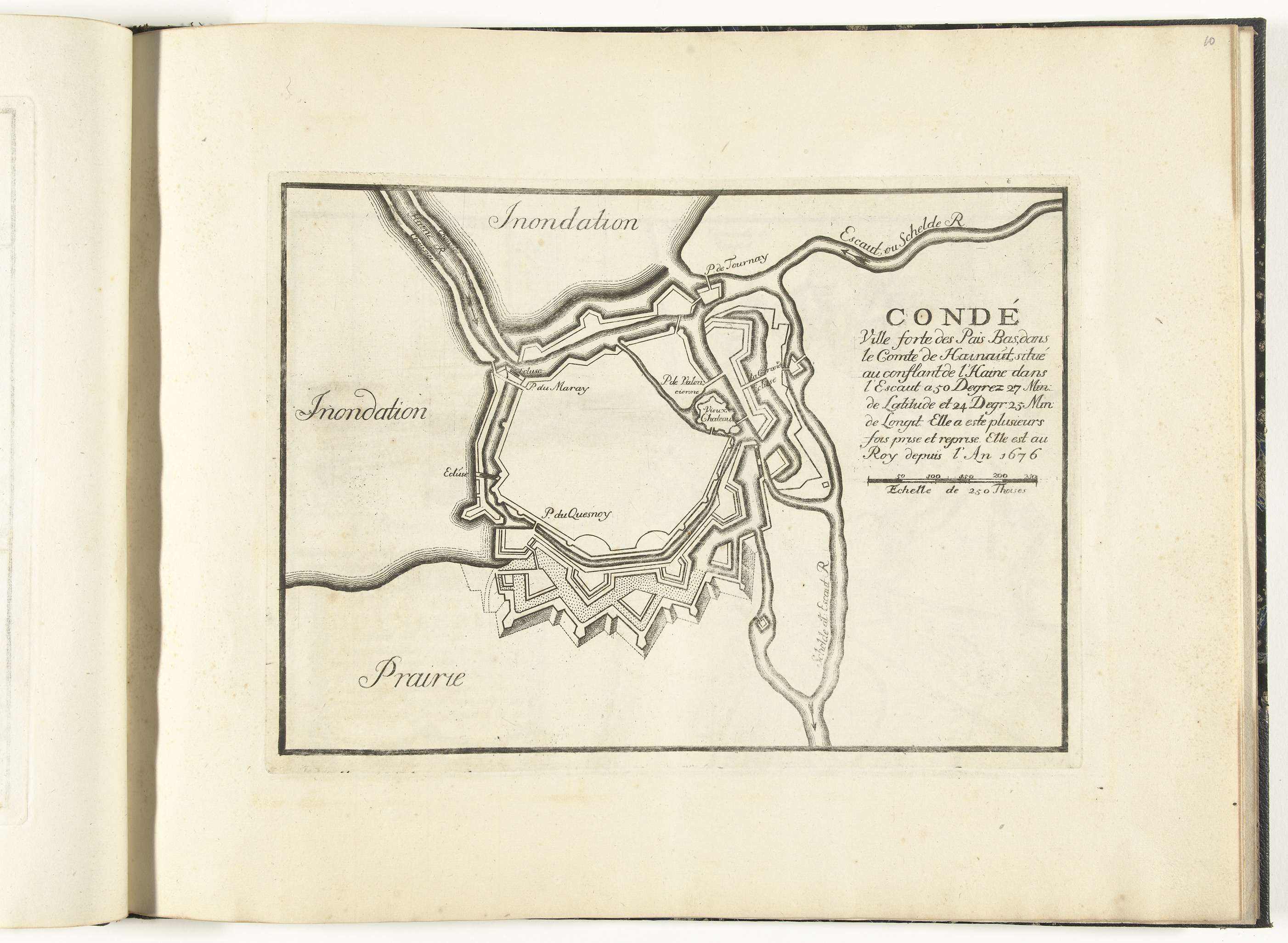 Plattegrond van de versterkingen om de stad Condé-sur-l'Escaut in de graafschap Henegouwen. Maakt deel uit van het eerste deel van het prentwerk: Le Theatre de la Guerre, dans les Pays-Bas, uitgegeven in 1696. Dit deel bevat 25 platen met plannen (afkomstig van Sébastien Le Prestre, Seigneur de Vauban) van vermaarde sterke steden en vestingen in ...
