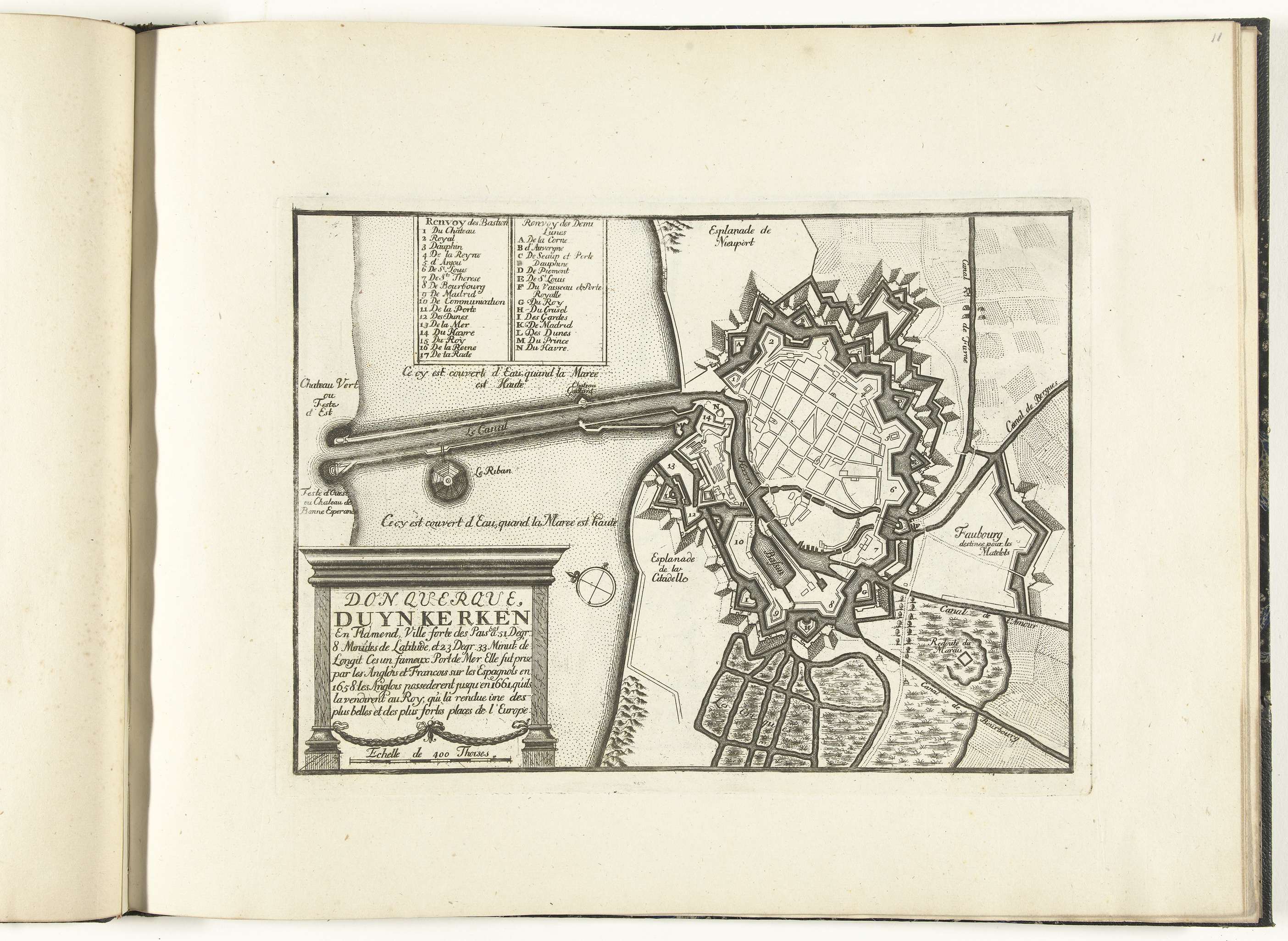 Plattegrond van de versterkingen om de Vlaamse stad Duinkerke. Maakt deel uit van het eerste deel van het prentwerk: Le Theatre de la Guerre, dans les Pays-Bas, uitgegeven in 1696. Dit deel bevat 25 platen met plannen (afkomstig van Sébastien Le Prestre, Seigneur de Vauban) van vermaarde sterke steden en vestingen in de Negenjarige Oorlog ...