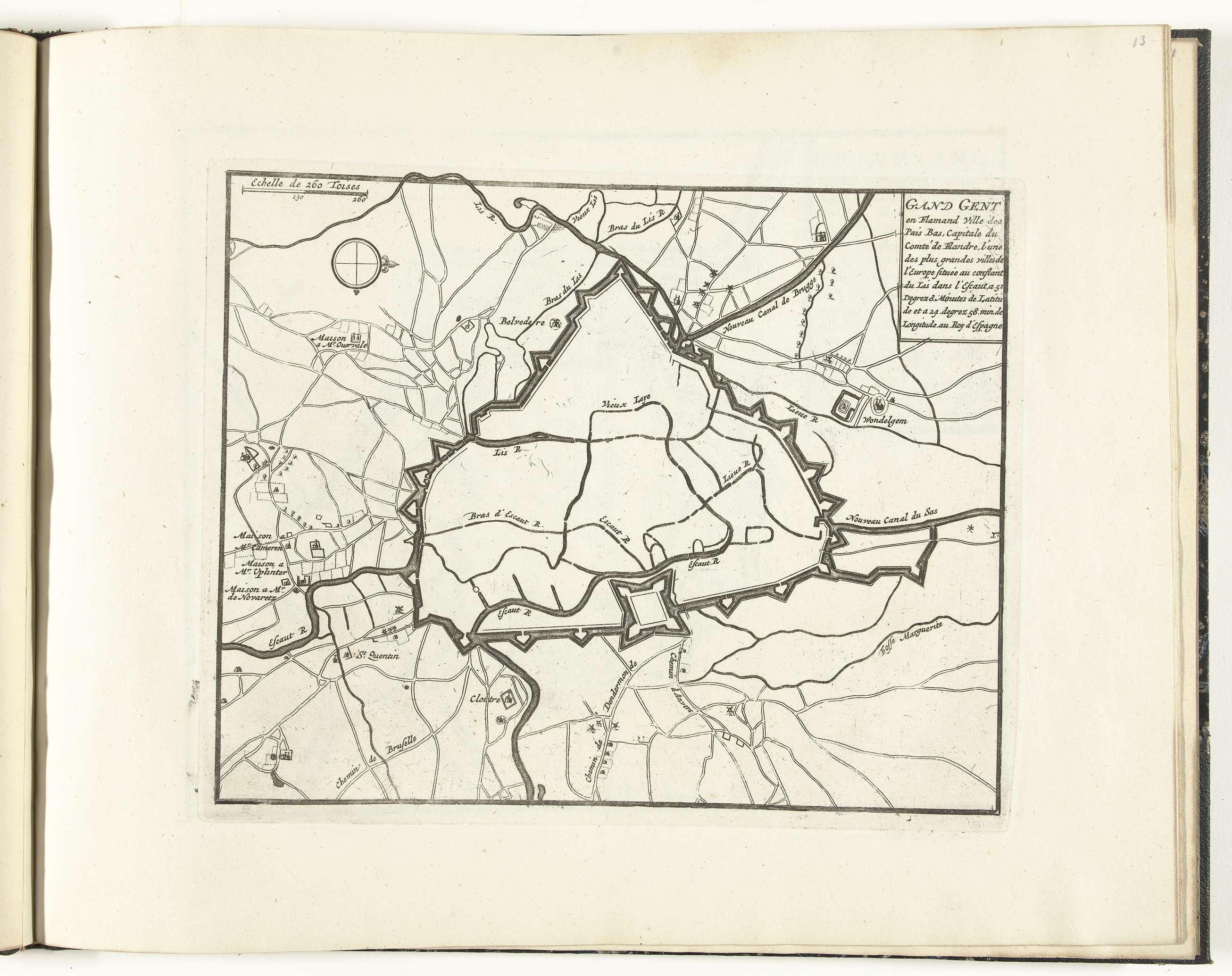 Plattegrond van de versterkingen om de Vlaamse stad Gent. Maakt deel uit van het eerste deel van het prentwerk: Le Theatre de la Guerre, dans les Pays-Bas, uitgegeven in 1696. Dit deel bevat 25 platen met plannen (afkomstig van Sébastien Le Prestre, Seigneur de Vauban) van vermaarde sterke steden en vestingen in de Negenjarige Oorlog ...
