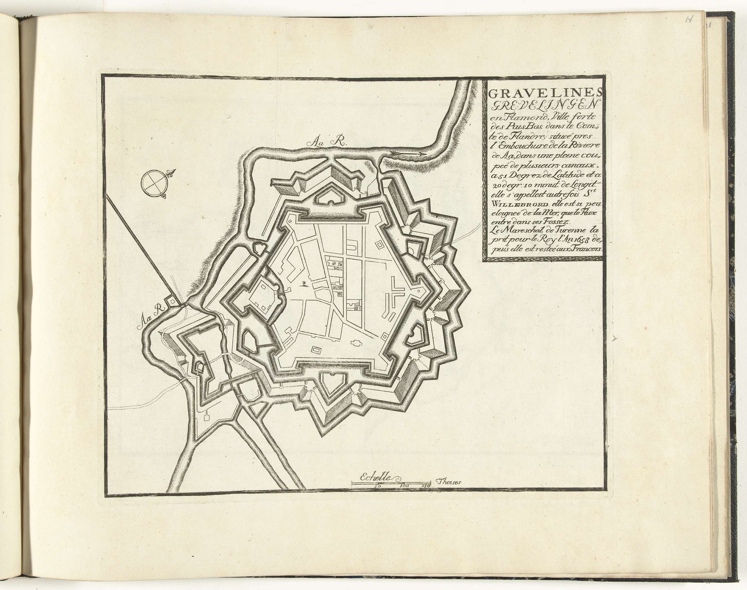 Plattegrond van de versterkingen om de Vlaamse stad Gravelines (Grevelingen). Maakt deel uit van het eerste deel van het prentwerk: Le Theatre de la Guerre, dans les Pays-Bas, uitgegeven in 1696. Dit deel bevat 25 platen met plannen (afkomstig van Sébastien Le Prestre, Seigneur de Vauban) van vermaarde sterke steden en vestingen in de Negenjarige ...